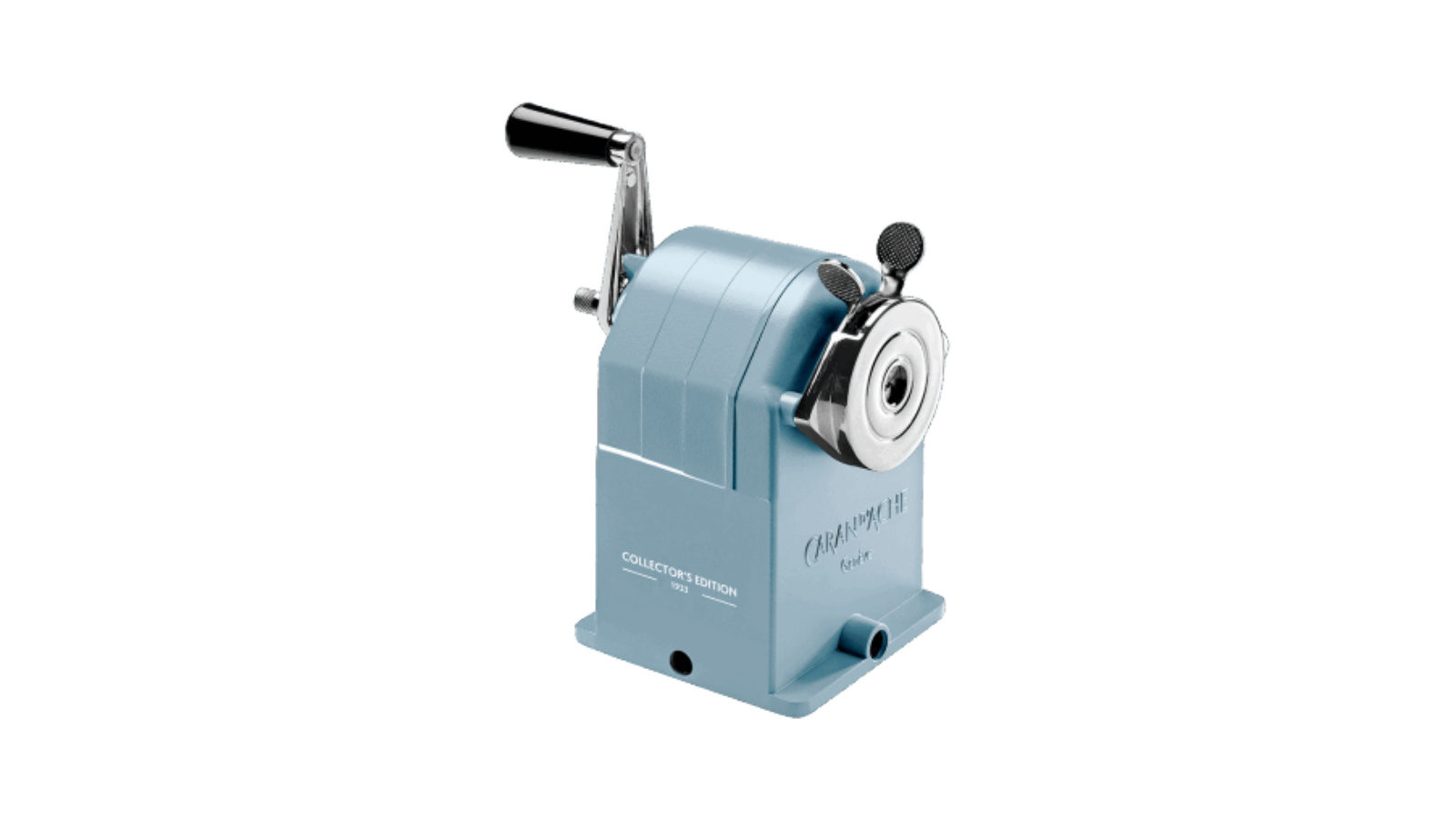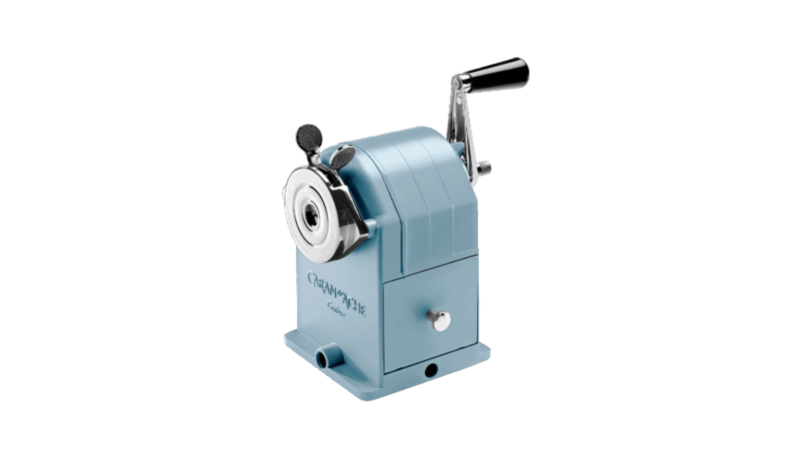 Temperamatite a manovella in metallo rivestito in blu ghiaccio iridescente dalla forma “antica”.