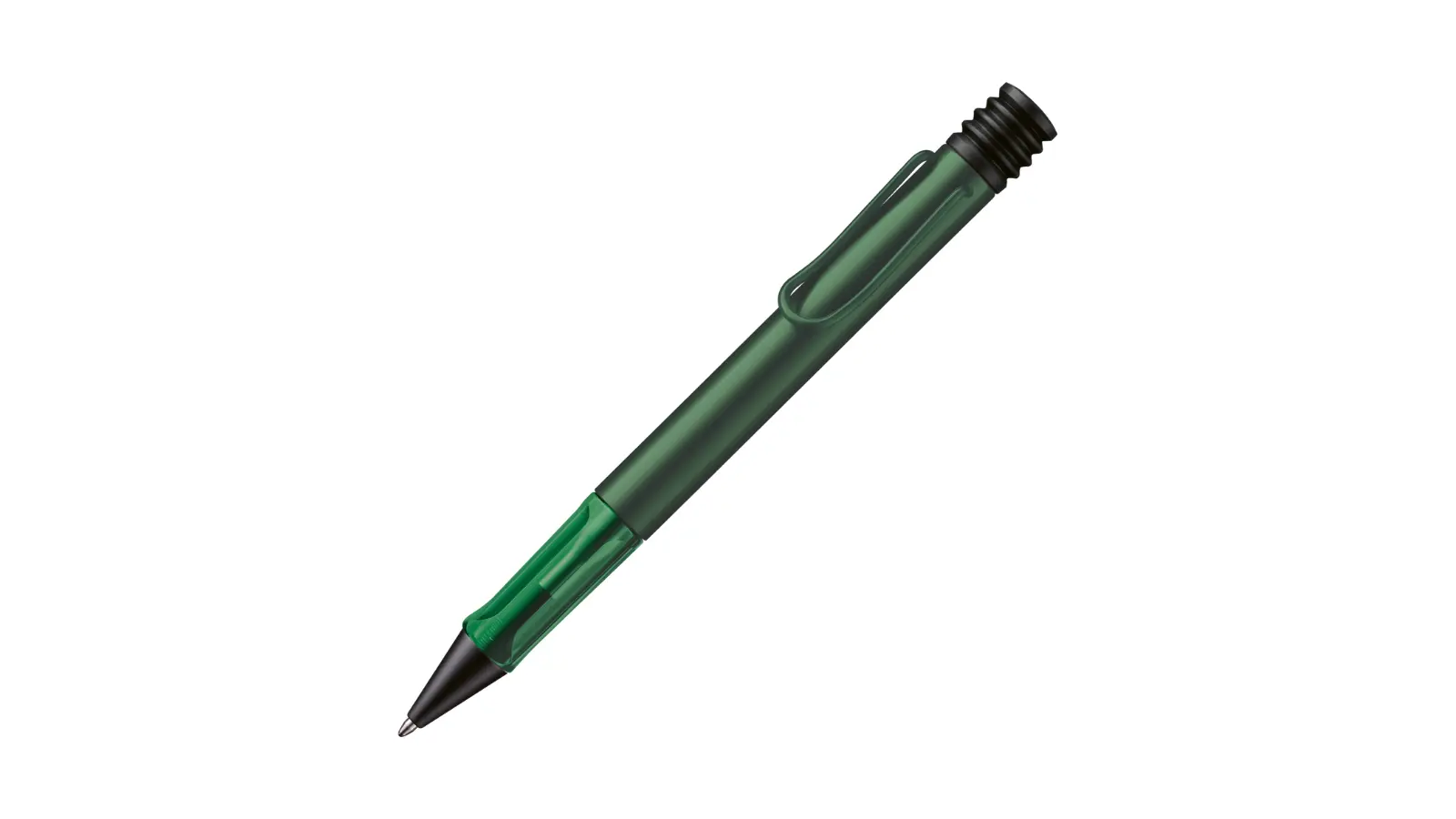 Penna a sfera Pine in alluminio anodizzato verde, elegante e profonda. Impugnatura trasparente tono su tono. La clip tono su tono con iconico fermaglio ad “U”. Meccanismo a pulsante.
