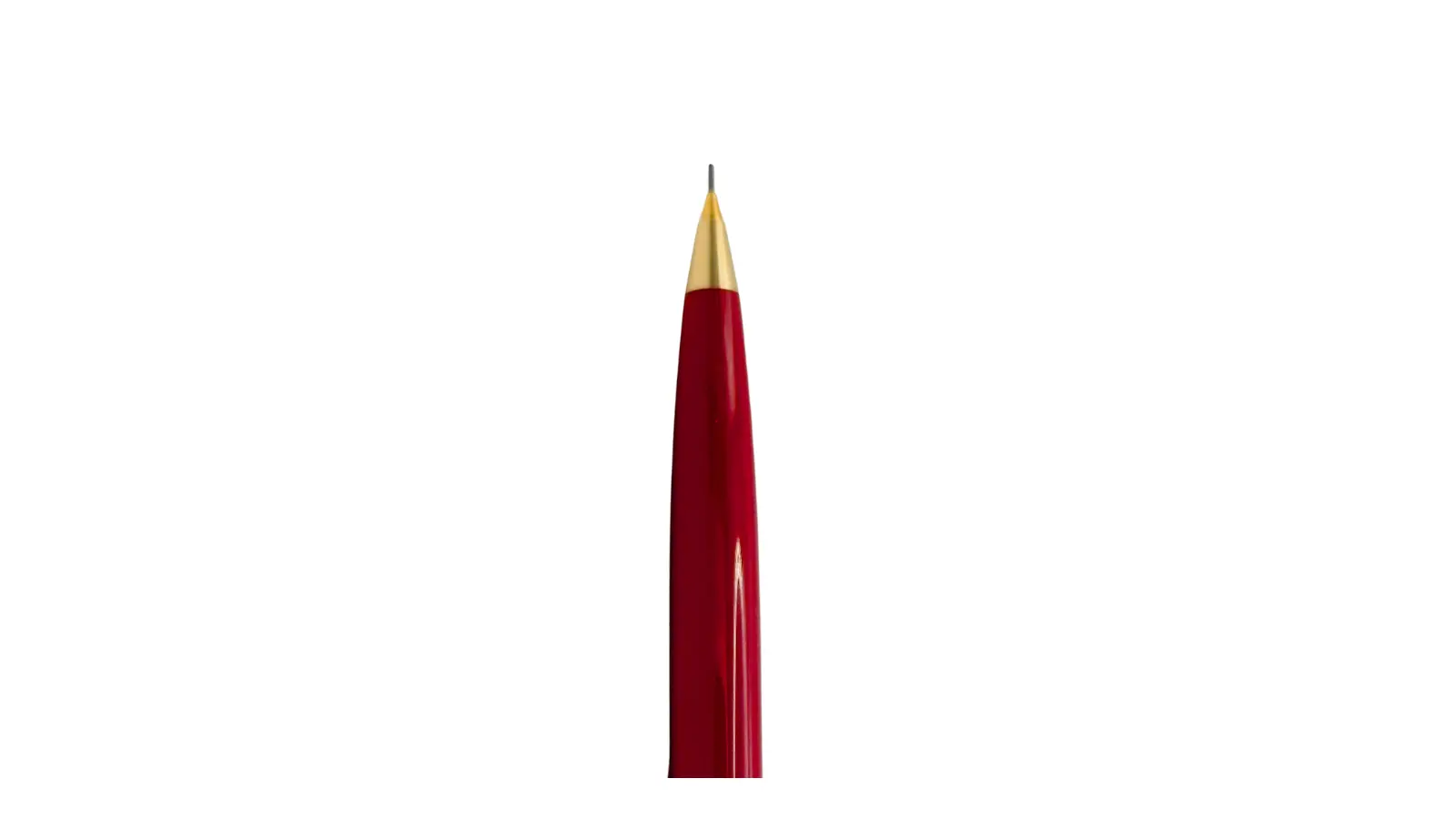 Matita interamente in resina rossa con clip e finiture placcate in oro. Meccanismo a rotazione per la fuoriuscita della mina di 0,7 mm.