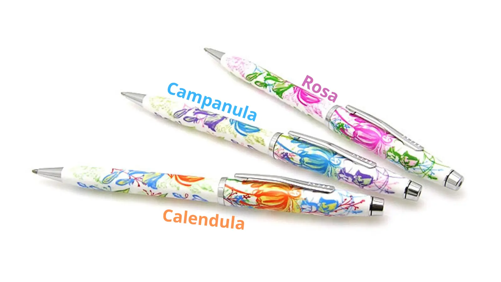 Penna a sfera interamente in lacca lucida. Disponibili in tre varianti: Calendula, Campanula e Rosa. Clip e finiture cromate. Meccanismo a rotazione.