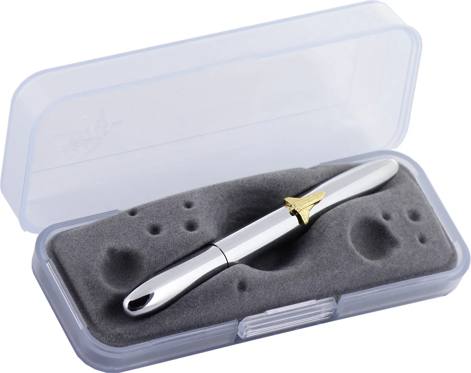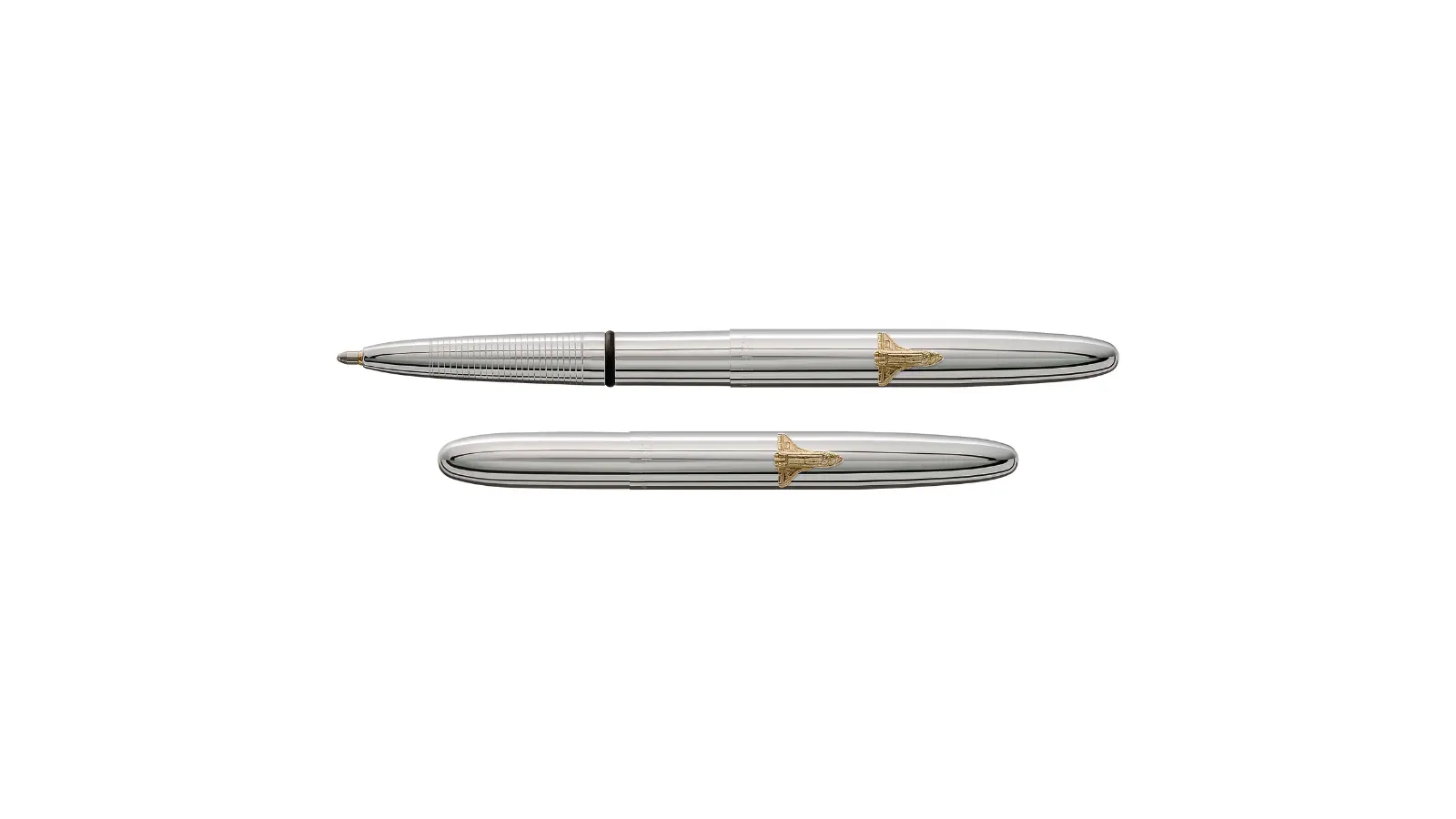 Penna a Sfera Bullet con cappuccio interamente in metallo cromato lucido. Emblema dello Shuttle dorato sul cappuccio. Refill pressurizzato.