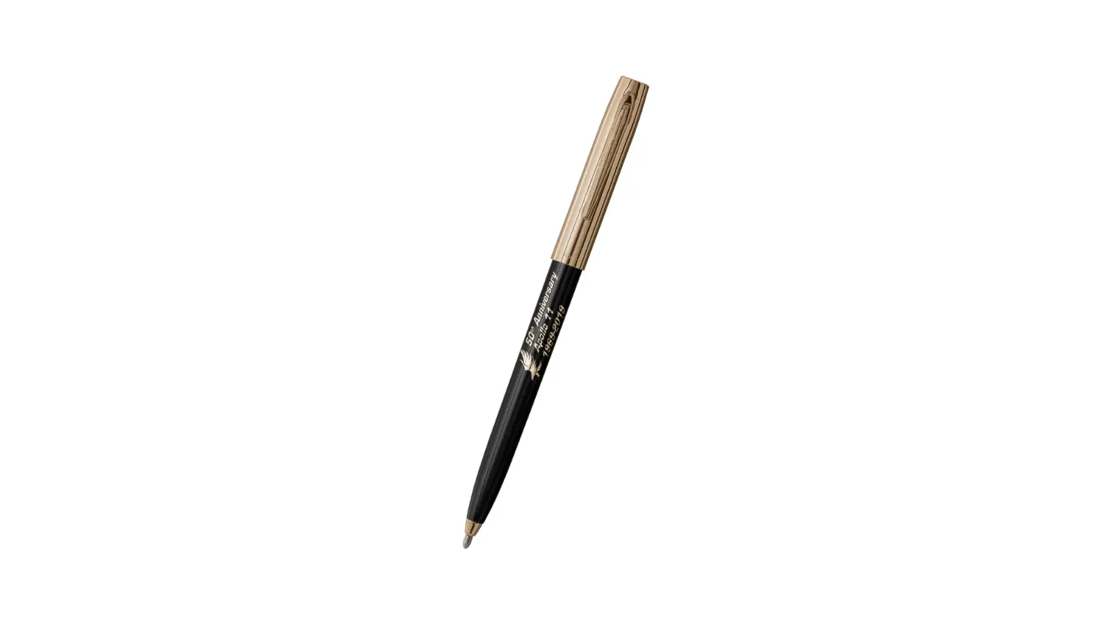 Penna a sfera Cap-O-Matic con cappuccio in metallo dorato e corpo in plastica nera, decorato con stampa oro dedicata al 50° anniversario della missione Apollo 11. Meccanismo a pulsante. Refill pressurizzato.