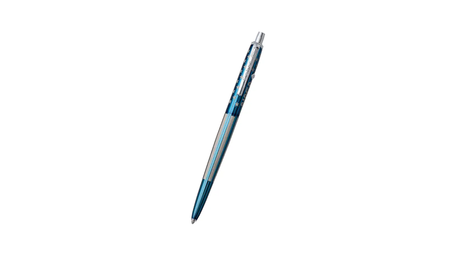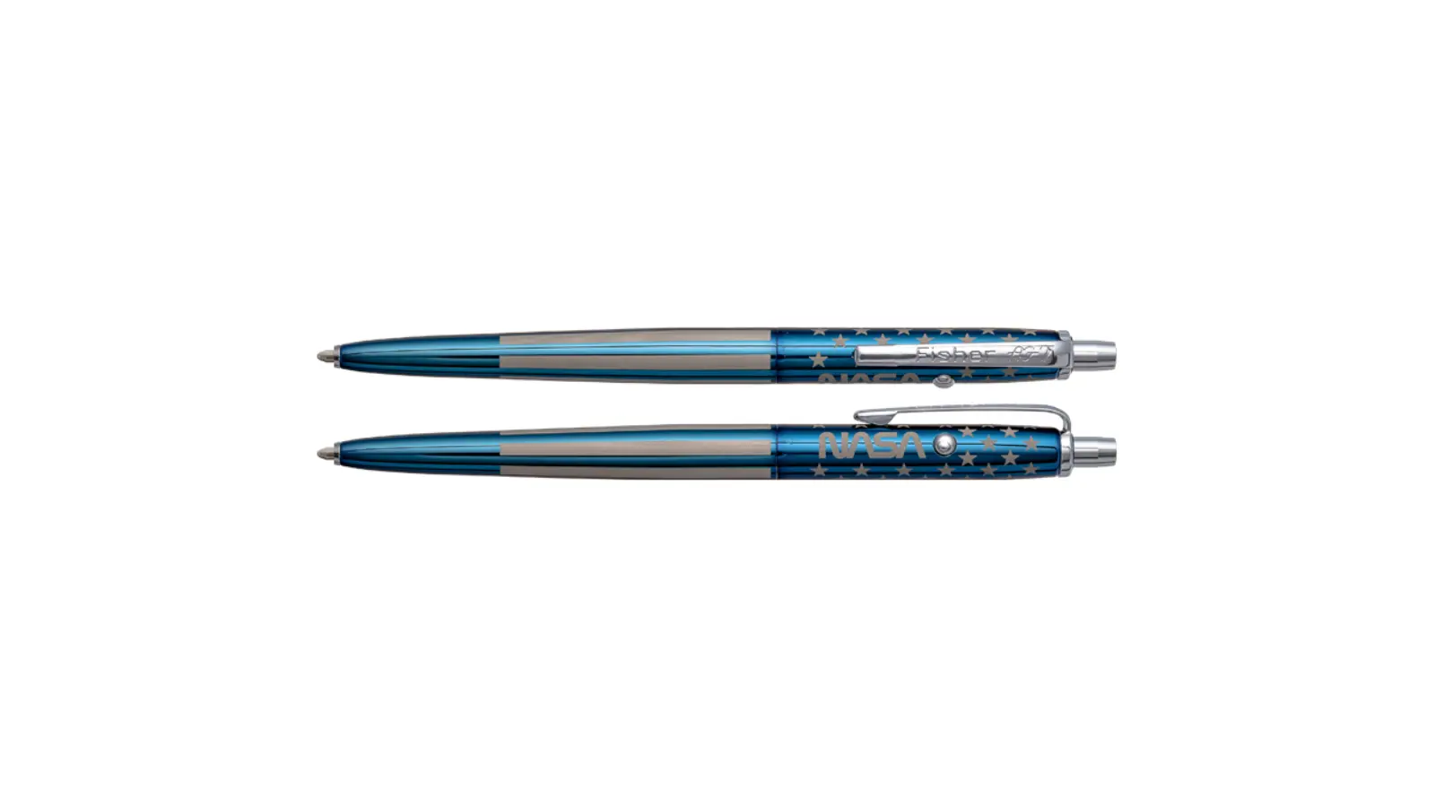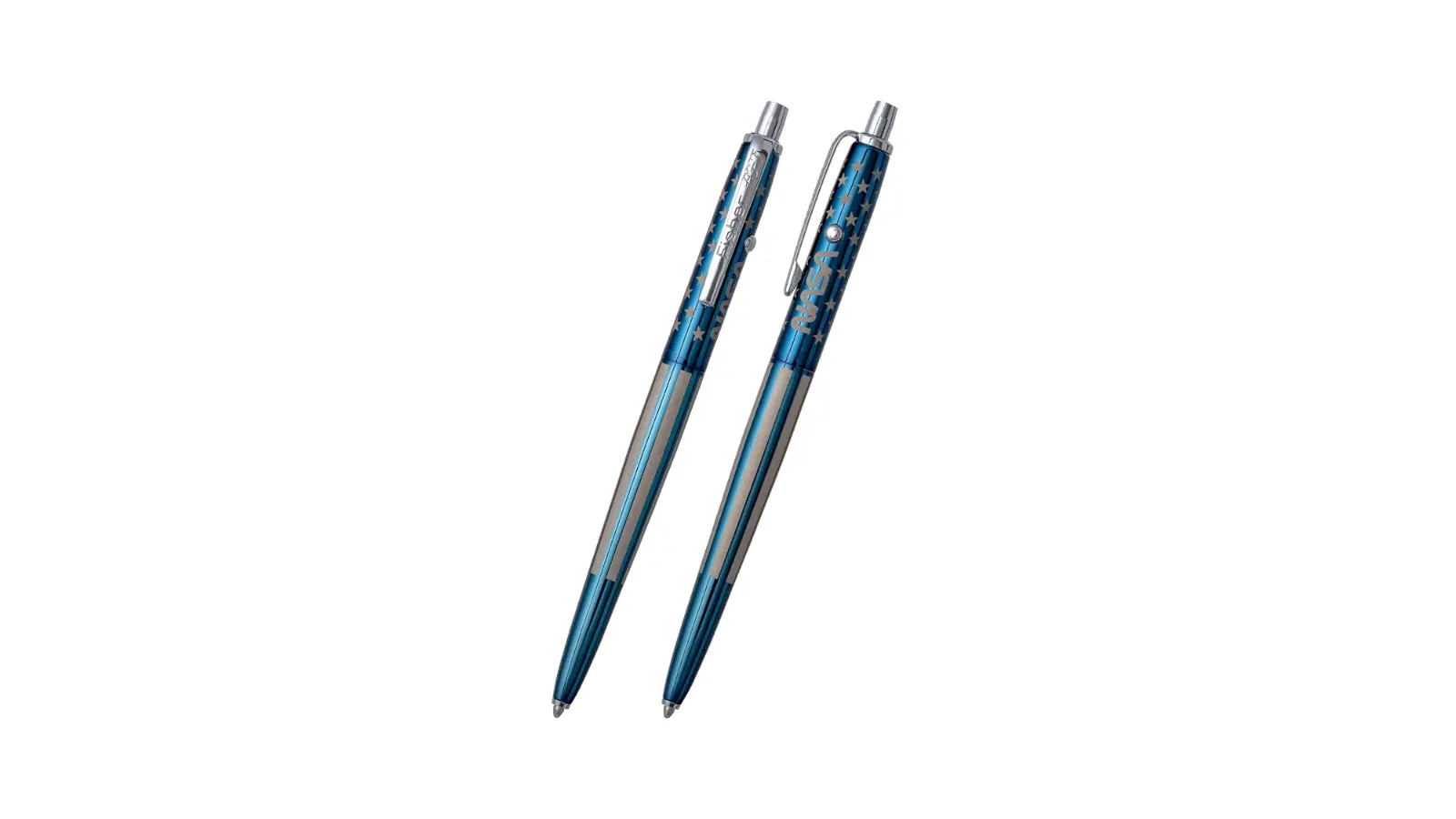 Penna a Sfera “Original Astronaut Space Pen” edizione speciale con logo NASA; interamente in nitruro di titanio blu. Ad adornare il fusto c’è il logo della NASA insieme a un elegante design a stelle e strisce inciso al laser. Meccanismo a clic che estende la punta tramite il pulsante sulla parte superiore ed un pulsante di rilascio sul lato per ritrarla. Refill pressurizzato.