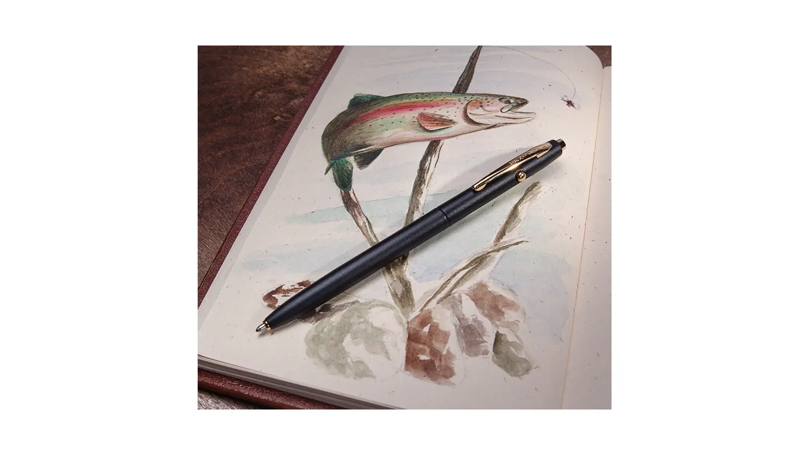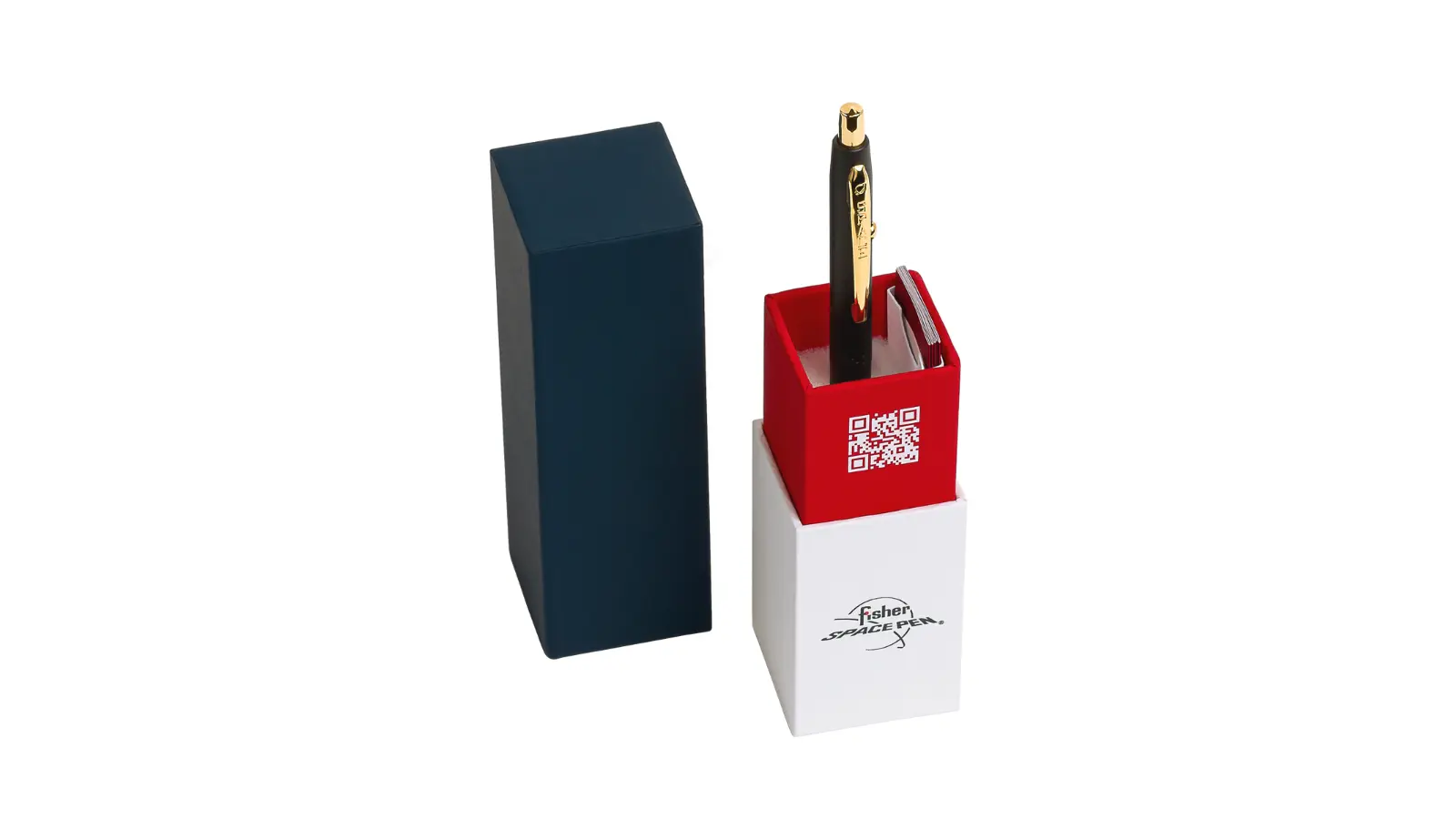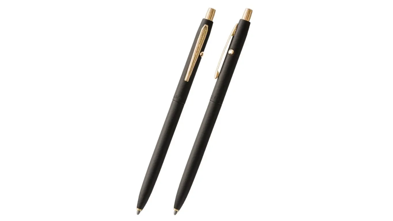 Penna a Sfera “Shuttle Space Pen” interamente in metallo nero opaco. Clip e finiture placcati oro. Meccanismo a clic che estende la punta tramite il pulsante sulla parte superiore ed un pulsante di rilascio sul lato per ritrarla. Refill pressurizzato.