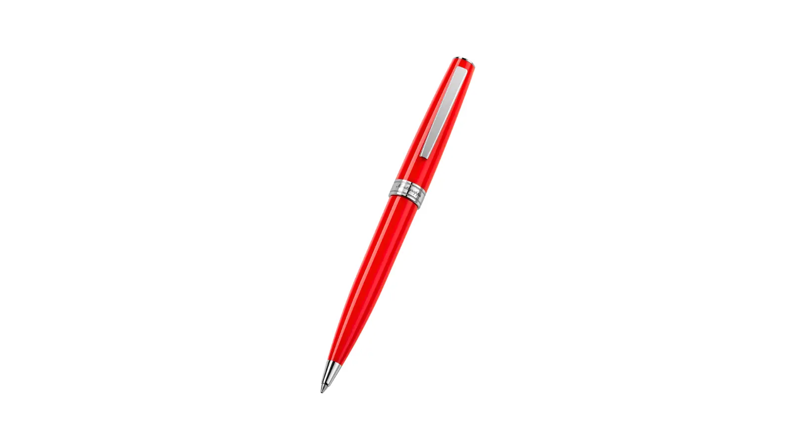 Penna a sfera interamente in resina di colore rosso. Clip e finiture cromate lucido. Meccanismo a rotazione