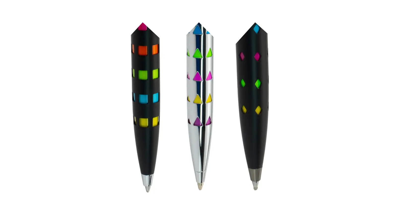 Penna a sfera in metallo intagliato che rivela un intricato gioco di color, evocando il mistero e l’eleganza dell’illusionismo. Disponibile in tre modelli: Quadrati (nero opaco), Diamanti (nero opaco) e Triangoli (Cromo). Meccanismo a rotazione.