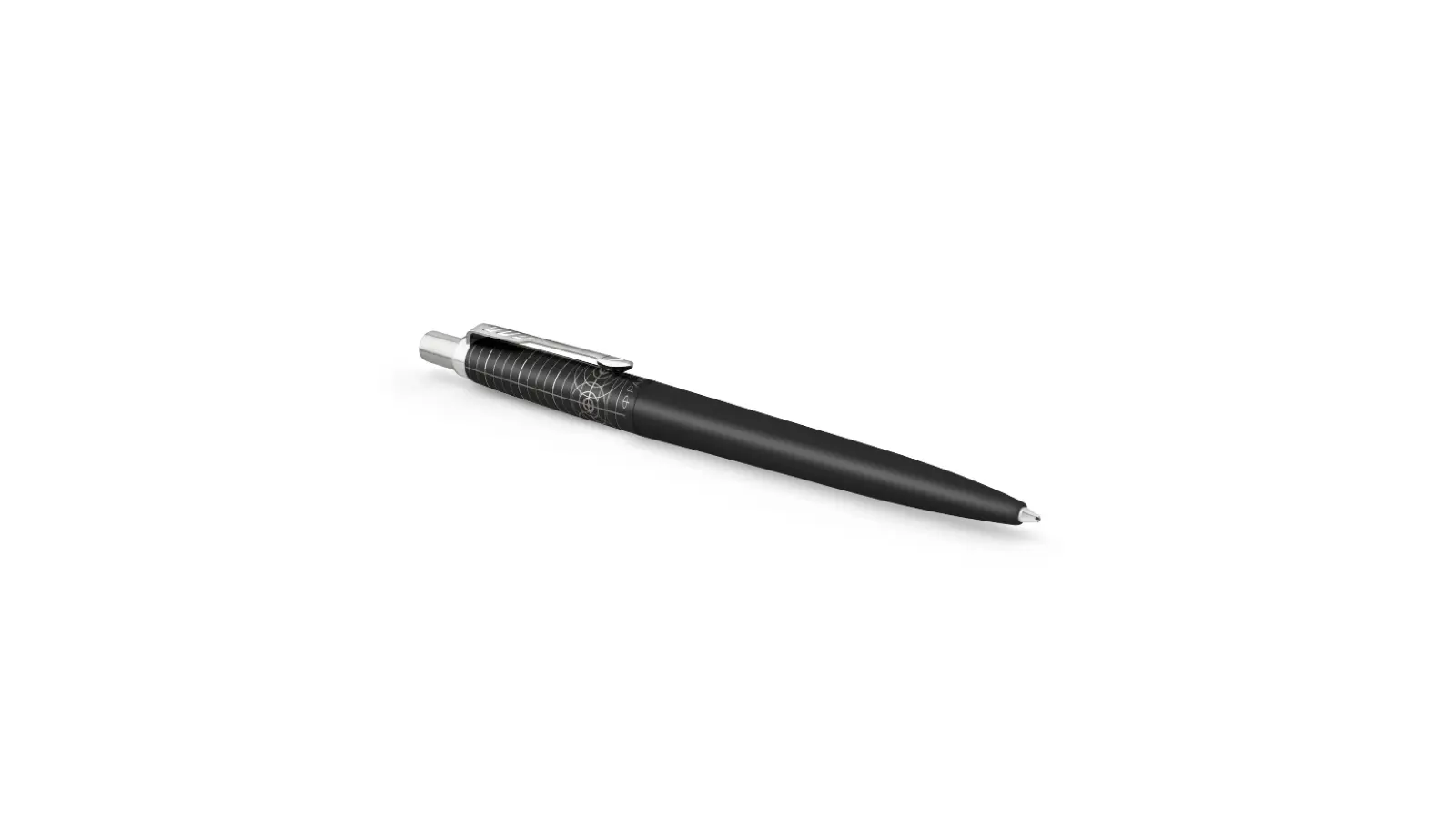 Penna a sfera con fusto in lacca nera opaca. Clip e finiture in acciaio inossidabile lucido. Sul cappuccio grafica di design laser argento opaco ispirato ai temi dell’aviazione. Meccanismo a pulsante.