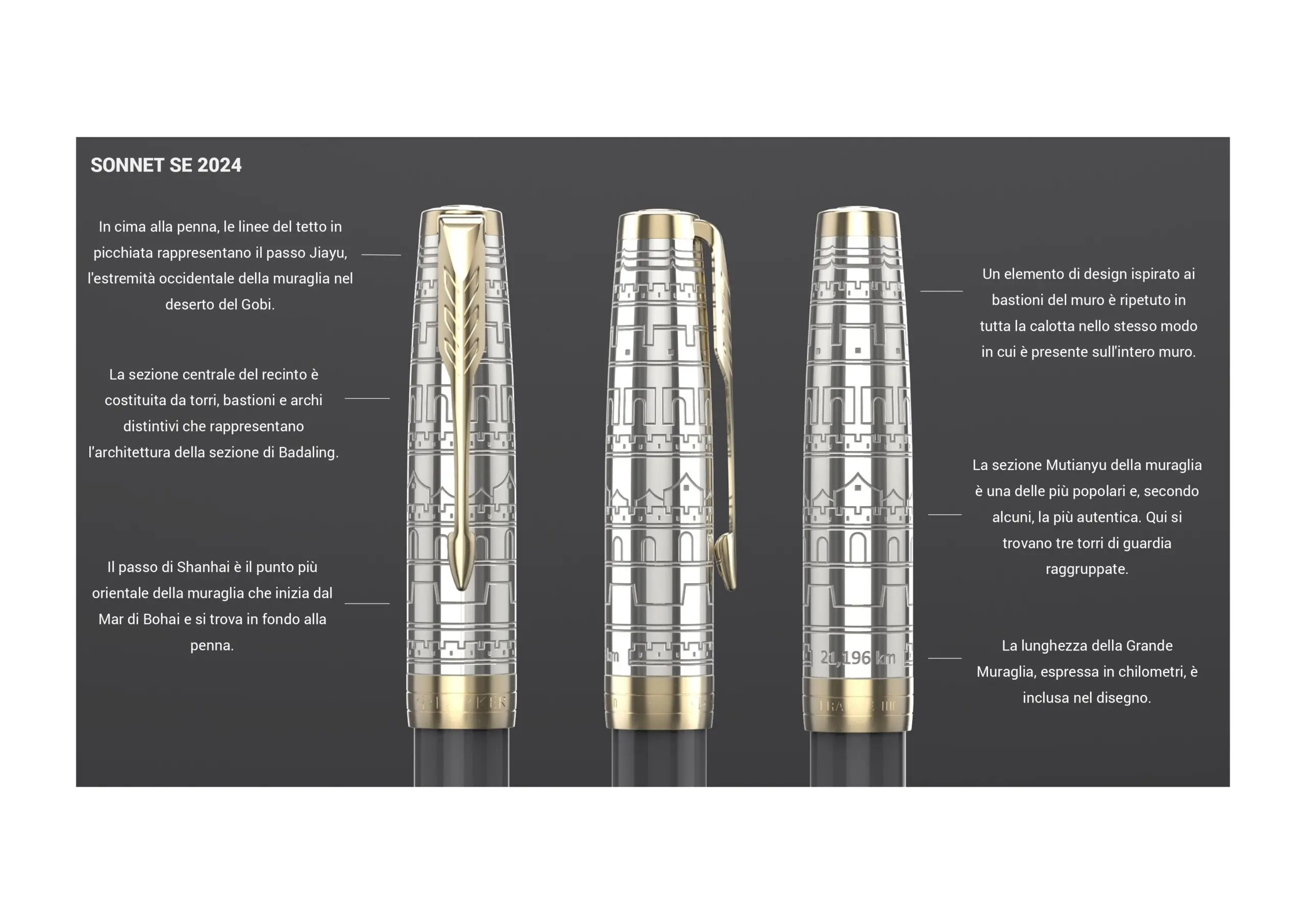 La penna a sfera Parker SONNET SE24 China rappresenta un capolavoro che cattura la maestosità della Grande Muraglia cinese in un design raffinato.