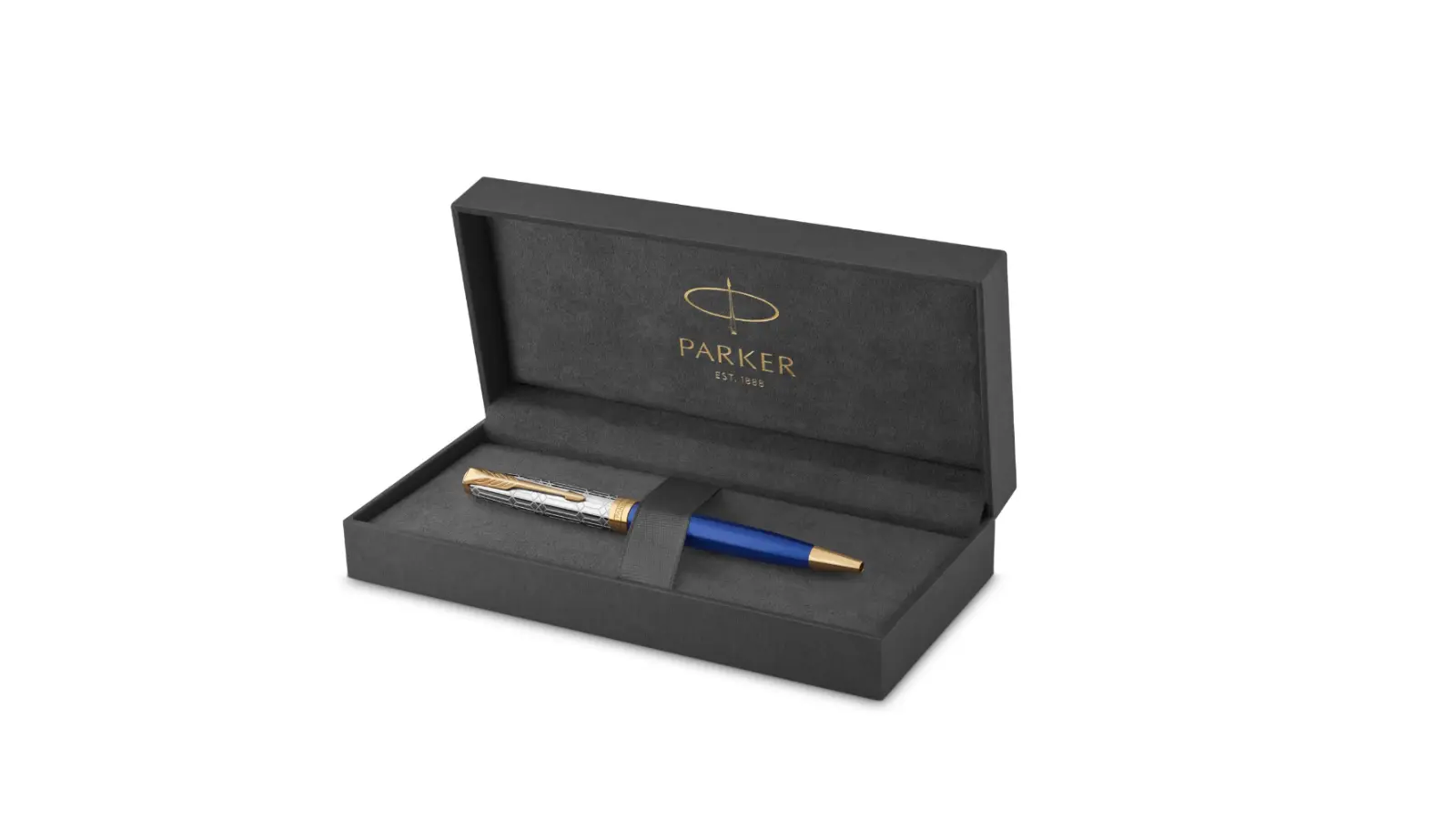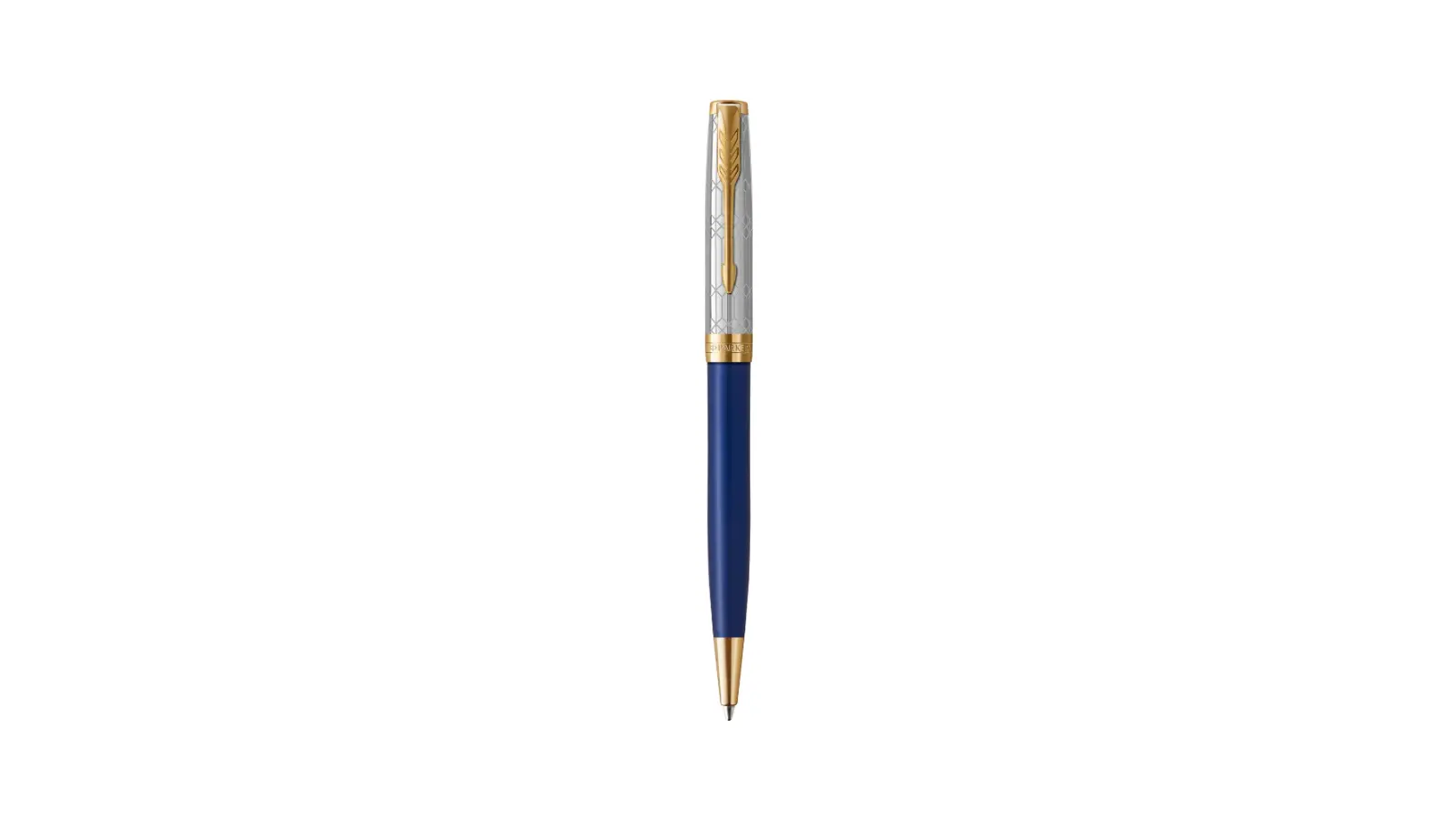 Penna a sfera con corpo in lacca blu zaffiro lucido si ispira alle pietre preziose delle corone di Sant’Edoardo e dello Stato Imperiale. Cappuccio in argento massiccio 925 rivestito in palladio, inciso e intrecciato. Finiture rivestite in oro 23k. Meccanismo a rotazione.