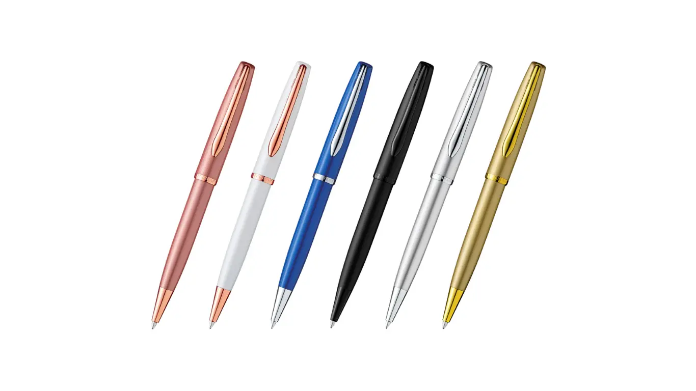 Penna a sfera interamente in metallo opacizzato disponibile in diversi colori: nero, blu, bianco, oro, argento e rosa. Clip e finiture cromate. Meccanismo a rotazione.