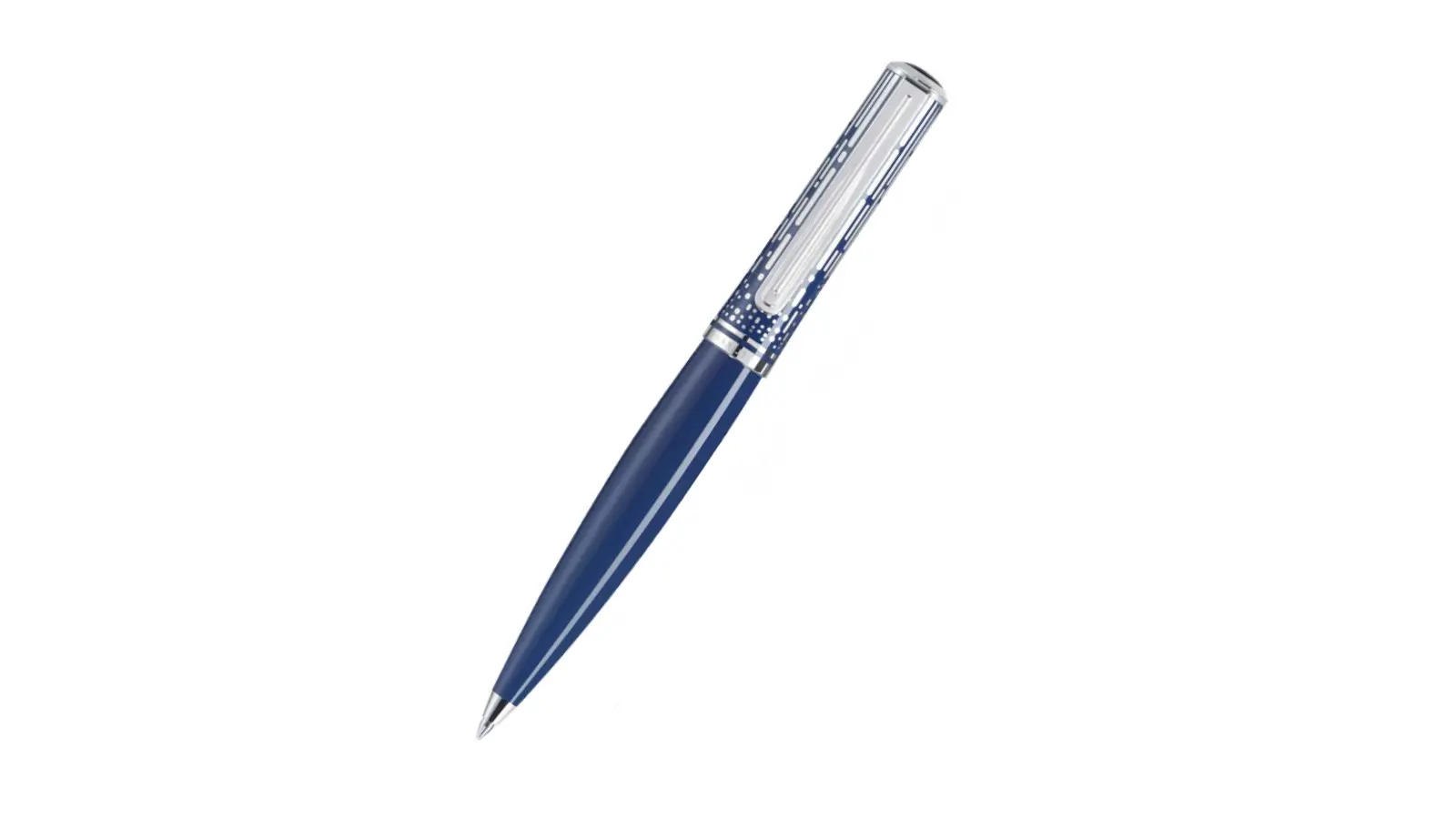Penna a sfera in resina pregiata blu e decorazioni sul cappuccio che richiamano il vertiginoso salto delle cascate del Niagara. Clip a forma di becco di pellicano con finiture laccate cromate. Meccanismo a rotazione.