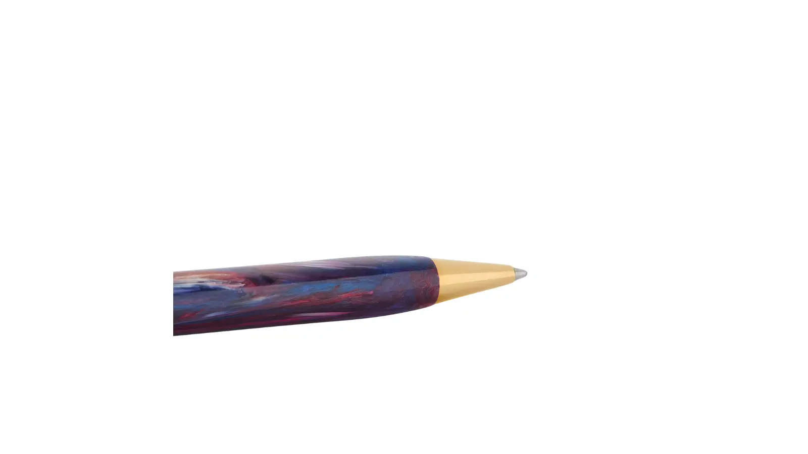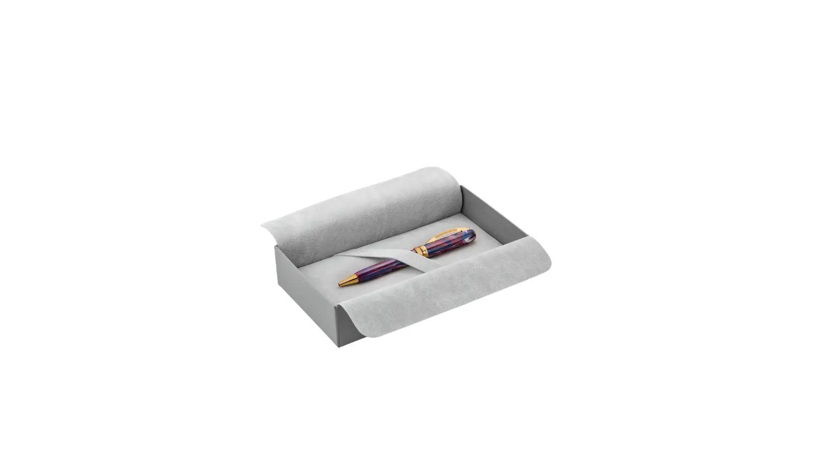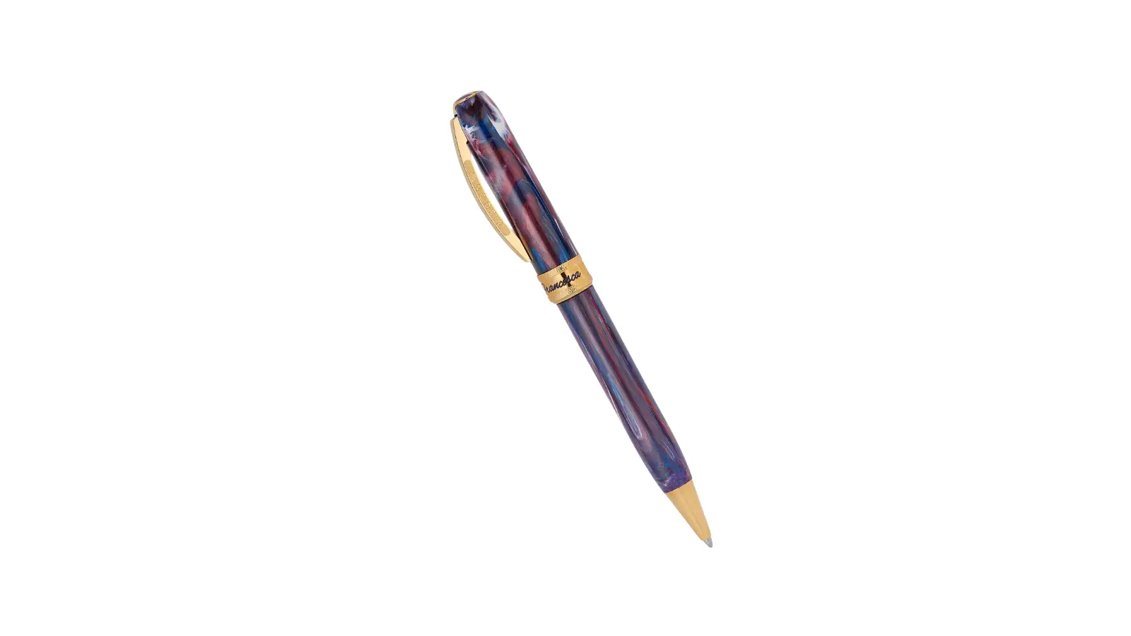 Penna a sfera in resina si caratterizza per un intreccio armonioso di rosso, viola, blu e bianco, colori che richiamano amore, desiderio e peccato. Il rosso associato a Francesca e il blu di Paolo si fondono in un viola profondo, a sottolineare la loro unione senza fine, dando vita a un elemento ricco di significato. I loro nomi, incisi e smaltati sull’anello centrale, rafforzano questa unione con un gesto discreto ma altamente simbolico. Clip e finiture in metallo dorato. Meccanismo a rotazione.