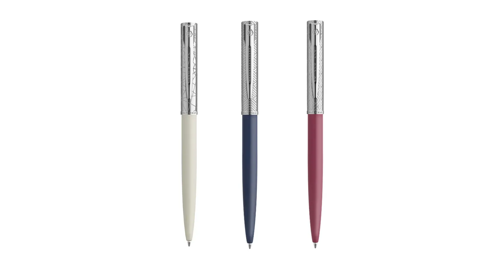 Penna a sfera interamente in lacca opaca disponibile in tre colori: blu, rosa e bianco. Clip a doppia ramificazione e cappuccio inciso con motivo lucido. Meccanismo a pulsante.