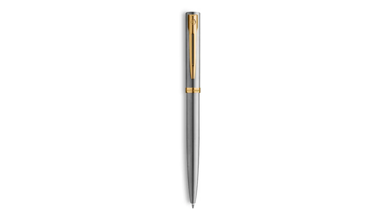 Penna a sfera interamente in acciaio inossidabile spazzolato. Clip e finiture oro. Silhouette elegante e slanciata. Meccanismo a rotazione.