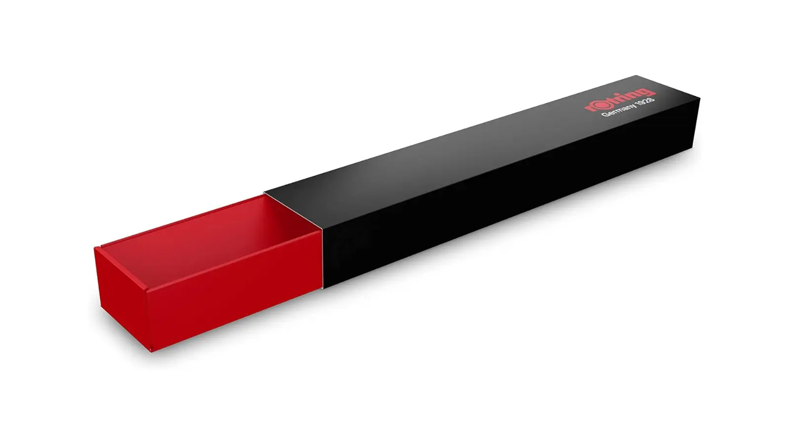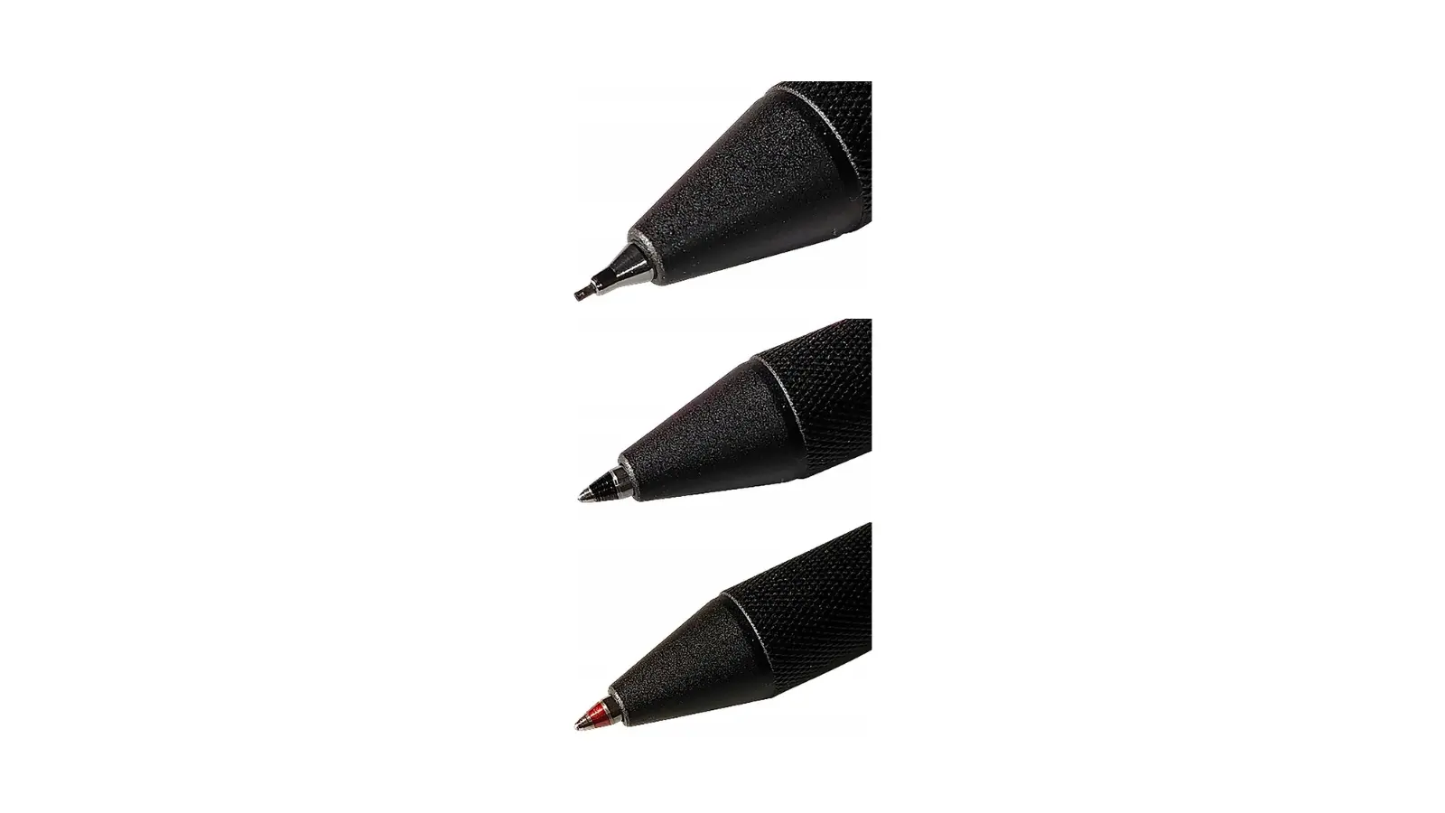 Penna con corpo ergonomico in metallo colore nero. Forma esagonale. Anello rosso simbolo iconico di Rotring. Meccanismo a rotazione che permette l’uscita di due punte a sfera con inchiostro nero e rosso e  matita mina da 0,5 mm.