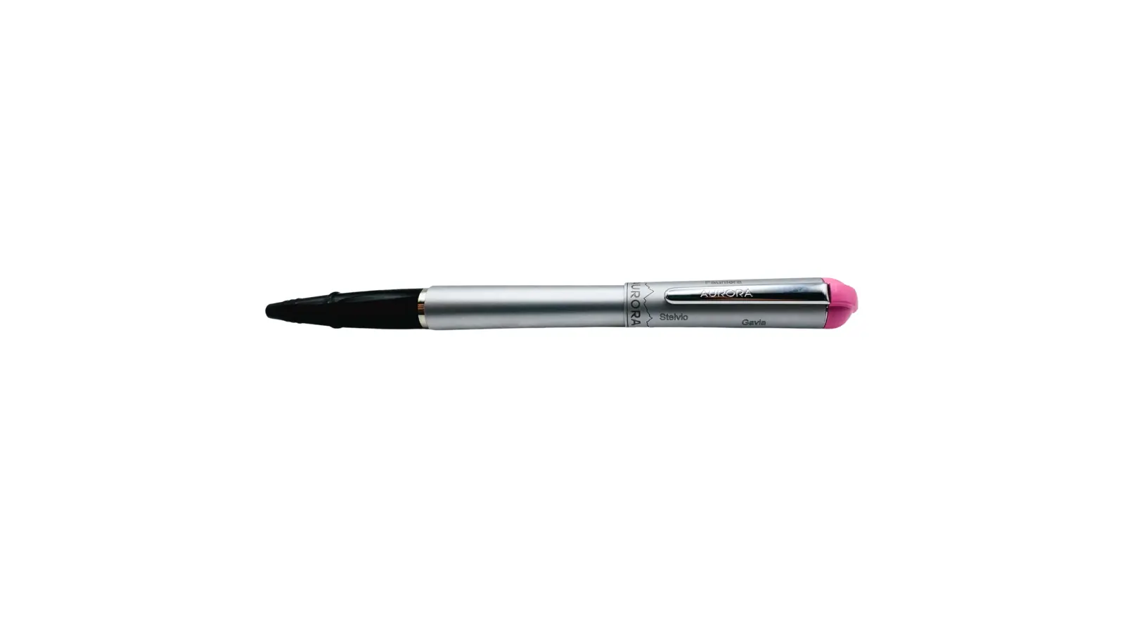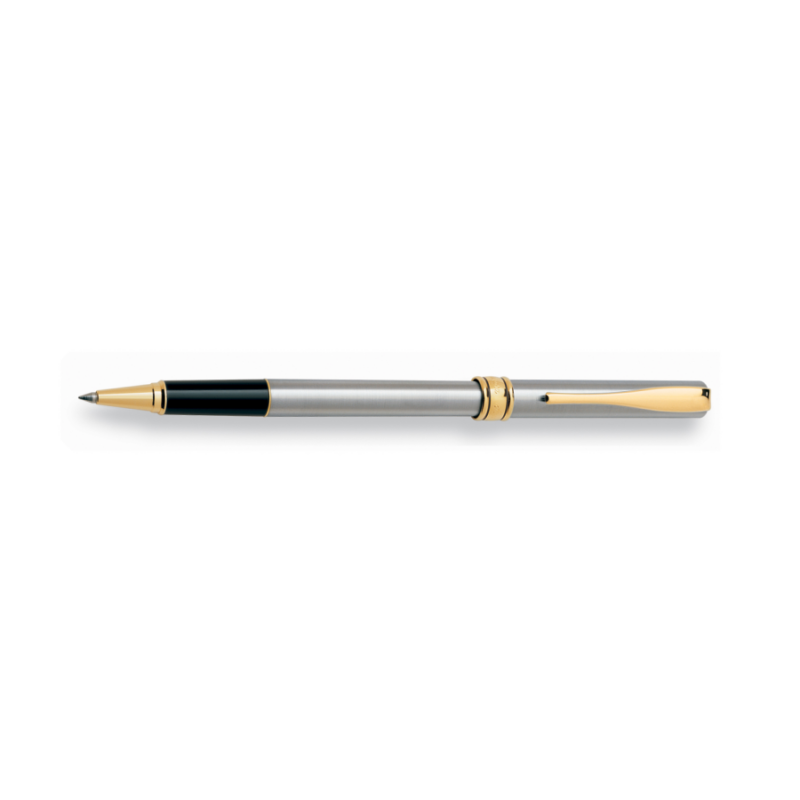 Penna roller con cappuccio interamente in metallo grigio. Testina in colore rosa. Refill rollerball Medio nero.