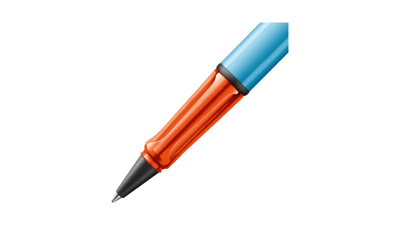 Penna roller Denim con cappuccio interamente in alluminio anodizzato color celeste e con impugnatura in plastica trasparente di colore arancione fluo. Dettagli neri con iconico fermaglio ad “U”. Refill rollerball Medio nero.