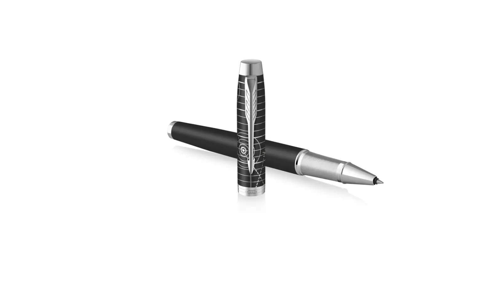 Penna roller interamente in lacca nera opaca su base in acciaio inox. Sul cappuccio grafica a laser in argento con motivi circolari che si ispirano alle carte aeronautiche, incorporando linee di rotta che evidenziano le destinazioni e le traiettorie di volo. Pennino Fine o Medio in acciaio inossidabile lucidato. Refill rollerball Fine nero.