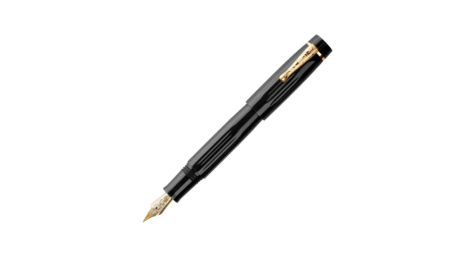 Clip e finiture dorate. Pennino Medio decorato a rilievo in acciaio inossidabile. Caricamento a stantuffo.