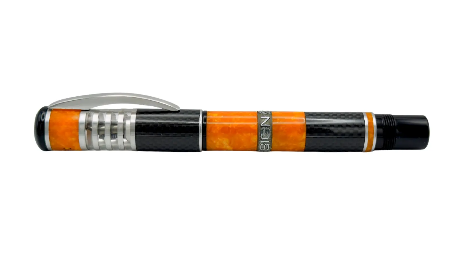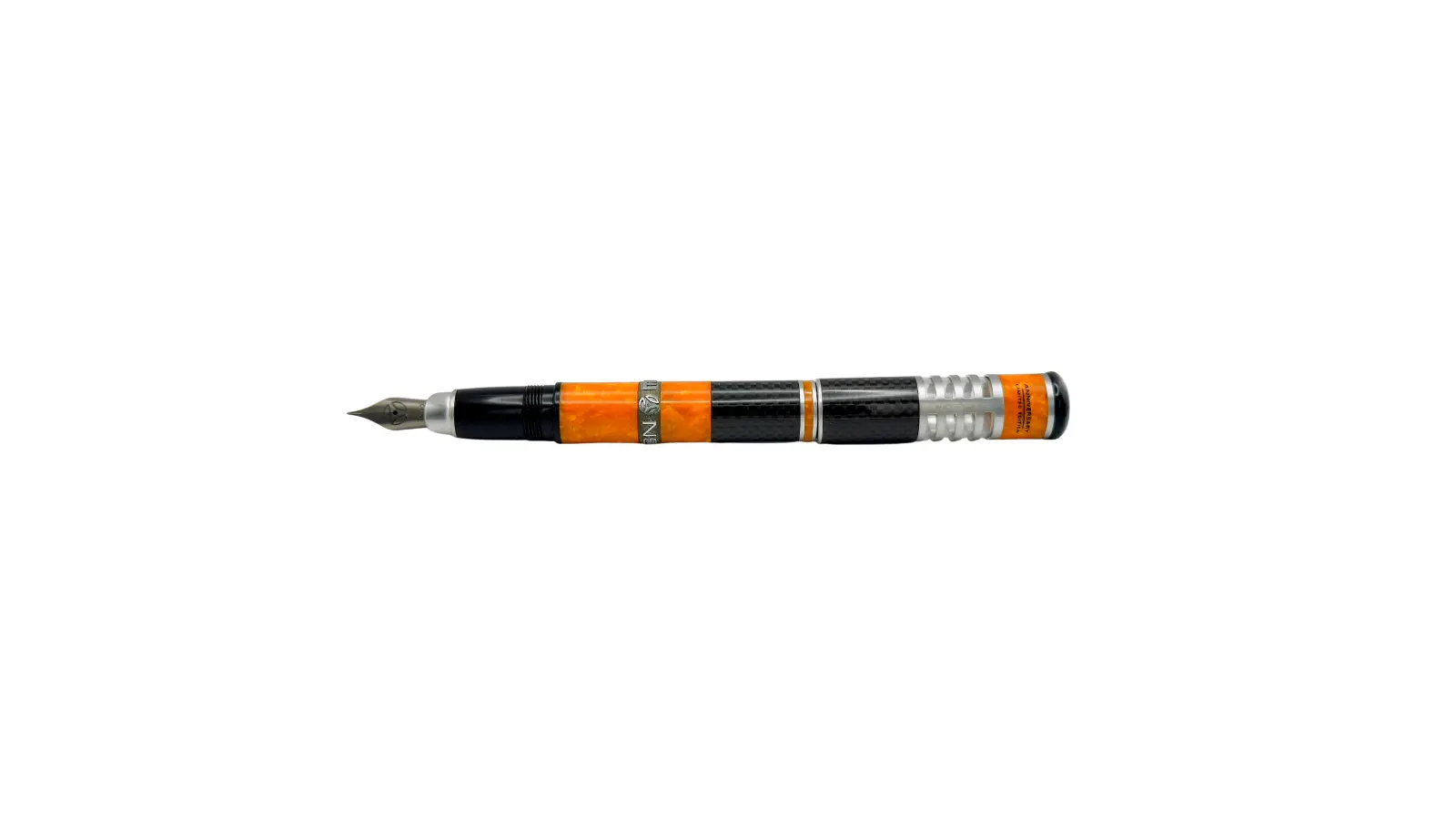 Penna stilografica in edizione limitata, in celluloide arancione in fibra di carbonio. Anello centrale in argento 925 con scritta “MOMO DESIGN”. Pennino Fine oro rodiato 18 kt. Caricamento a stantuffo.