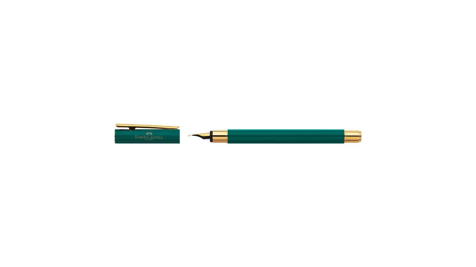 Penna stilografica in metallo laccato con fusto slim (sottile) in colore verde scuro. Clip e finiture dorate. Logo Faber Castell in oro. Pennino Fine o Medio in acciaio inox. Caricamento cartuccia e/o converter.