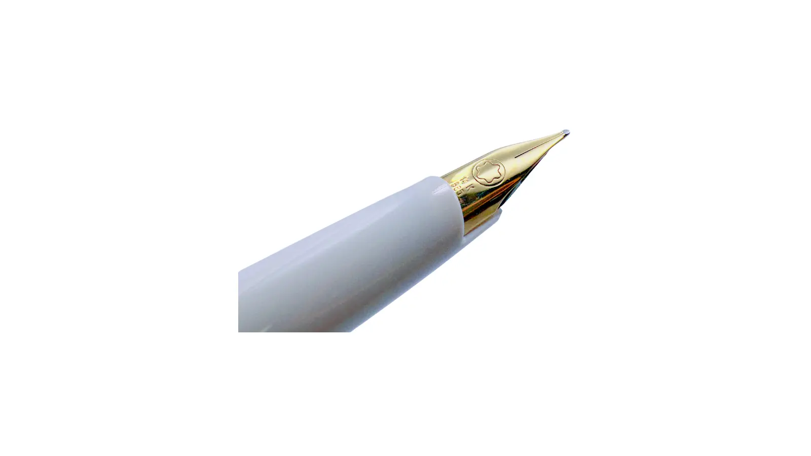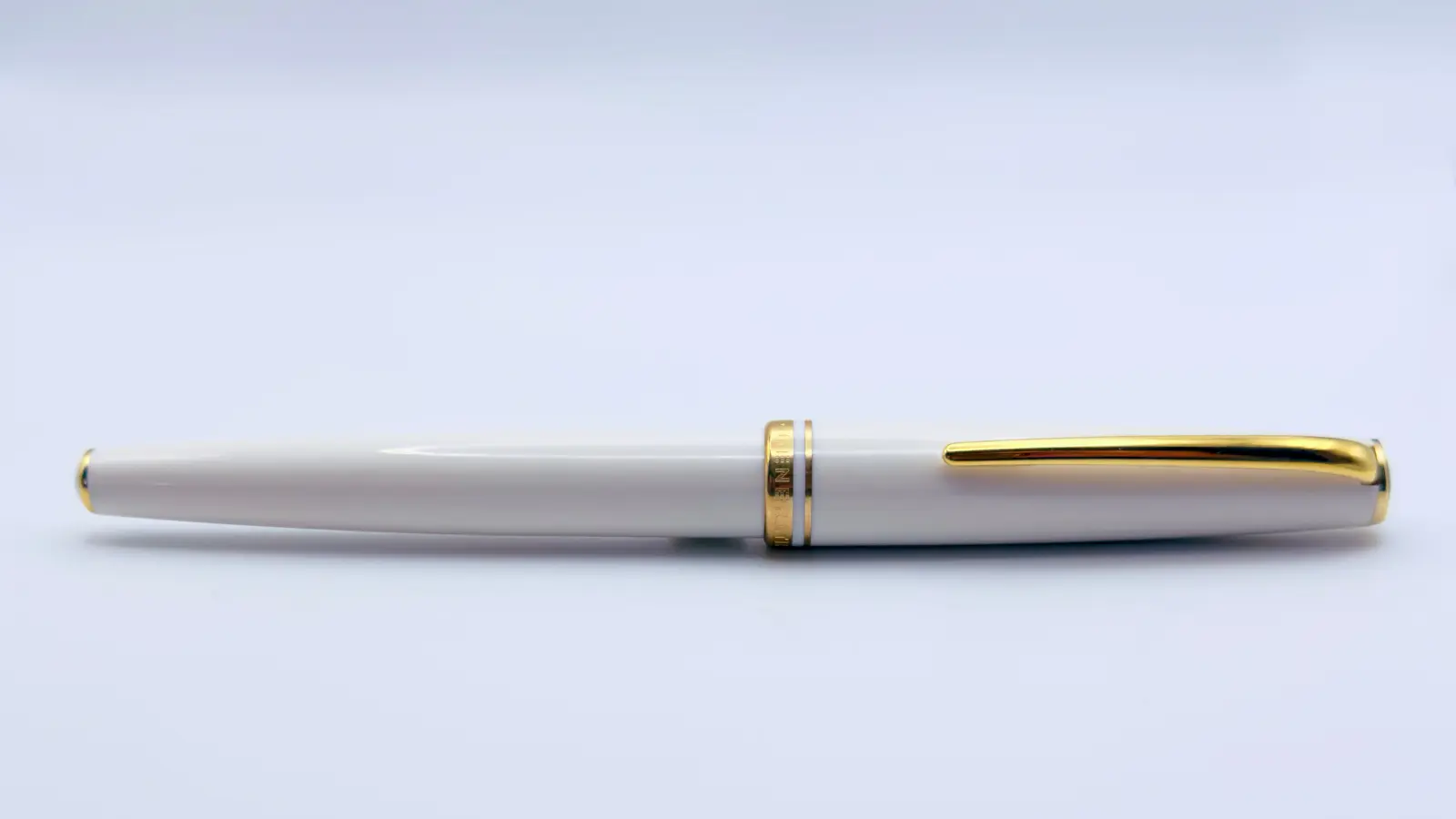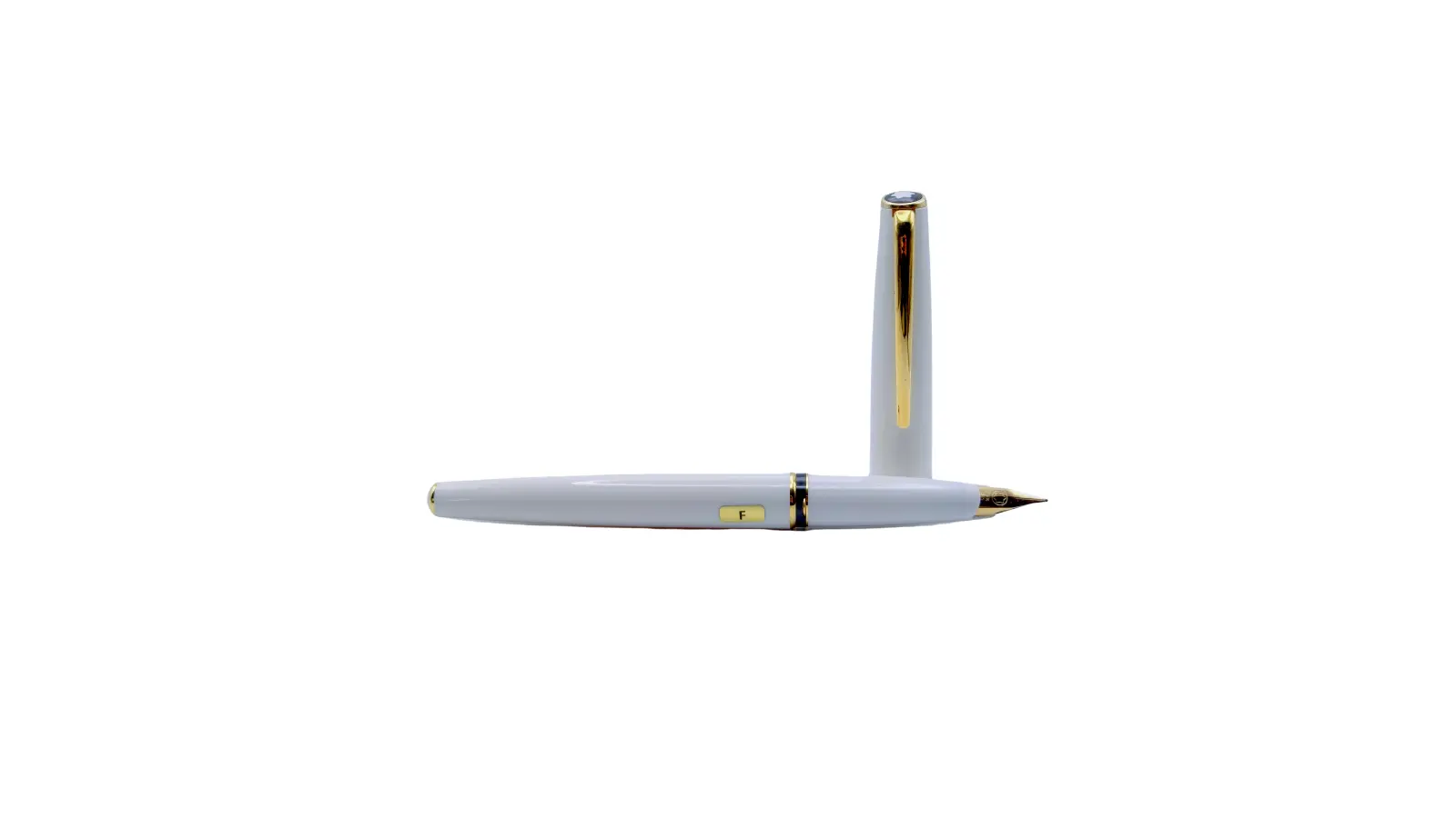 Penna stilografica interamente in resina bianca con clip e finiture placcate in oro. Pennino Fine in oro 14kt. Caricamento solo a cartuccia.