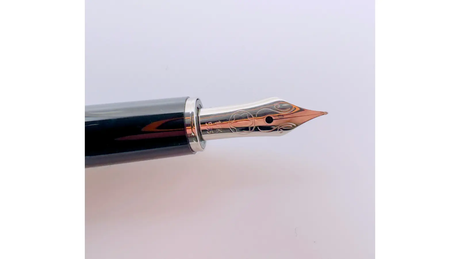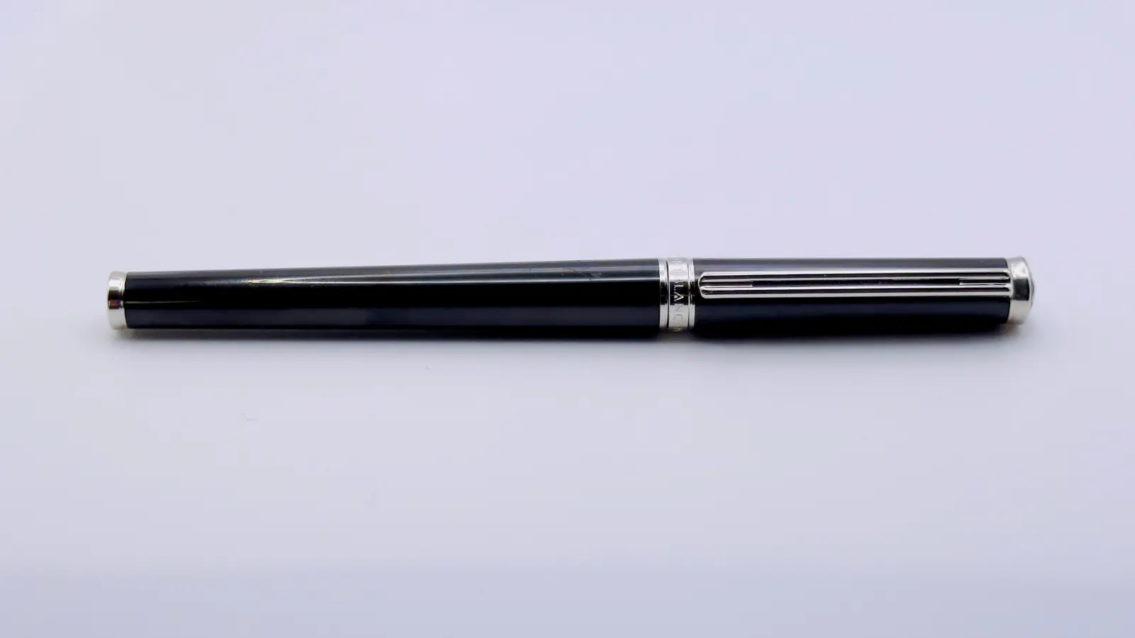 Penna stilografica interamente in resina nera. Clip e finiture cromate. Pennino Extra Fine o Medio in oro 14kt. Caricamento solo a cartuccia.