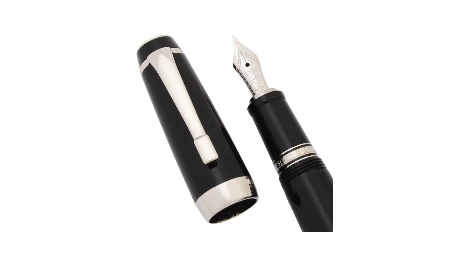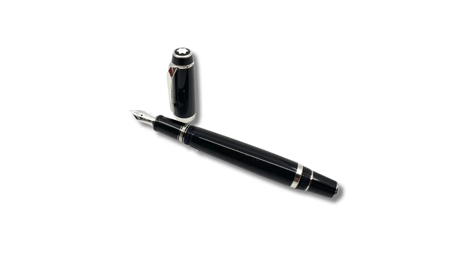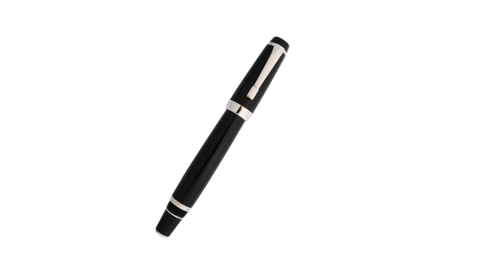 Penna stilografica interamente in resina nera. Cappuccio non impreziosito dallo zaffiro. Clip e finiture platino. Pennino Fine platinato non retrattile in oro 14kt. Caricamento a cartuccia e/o converter.
