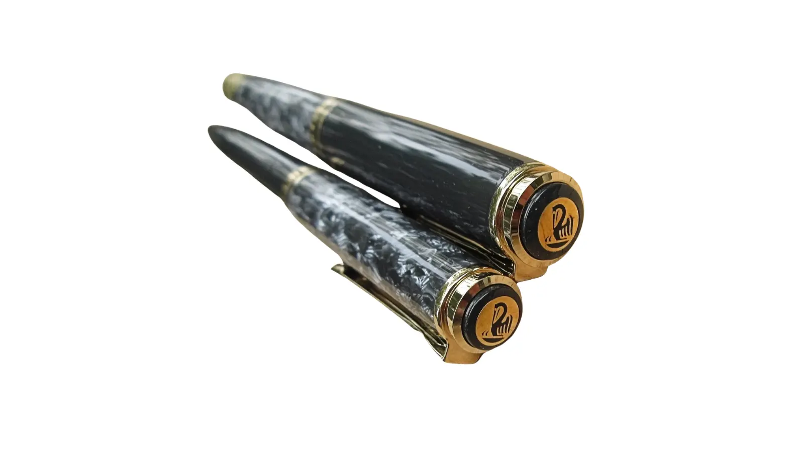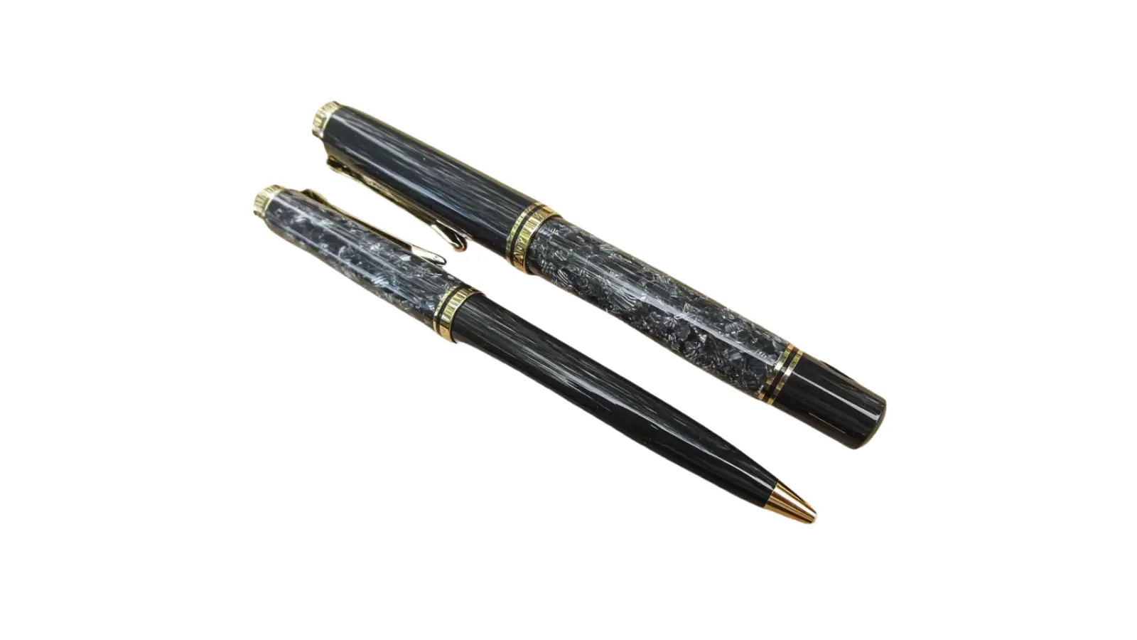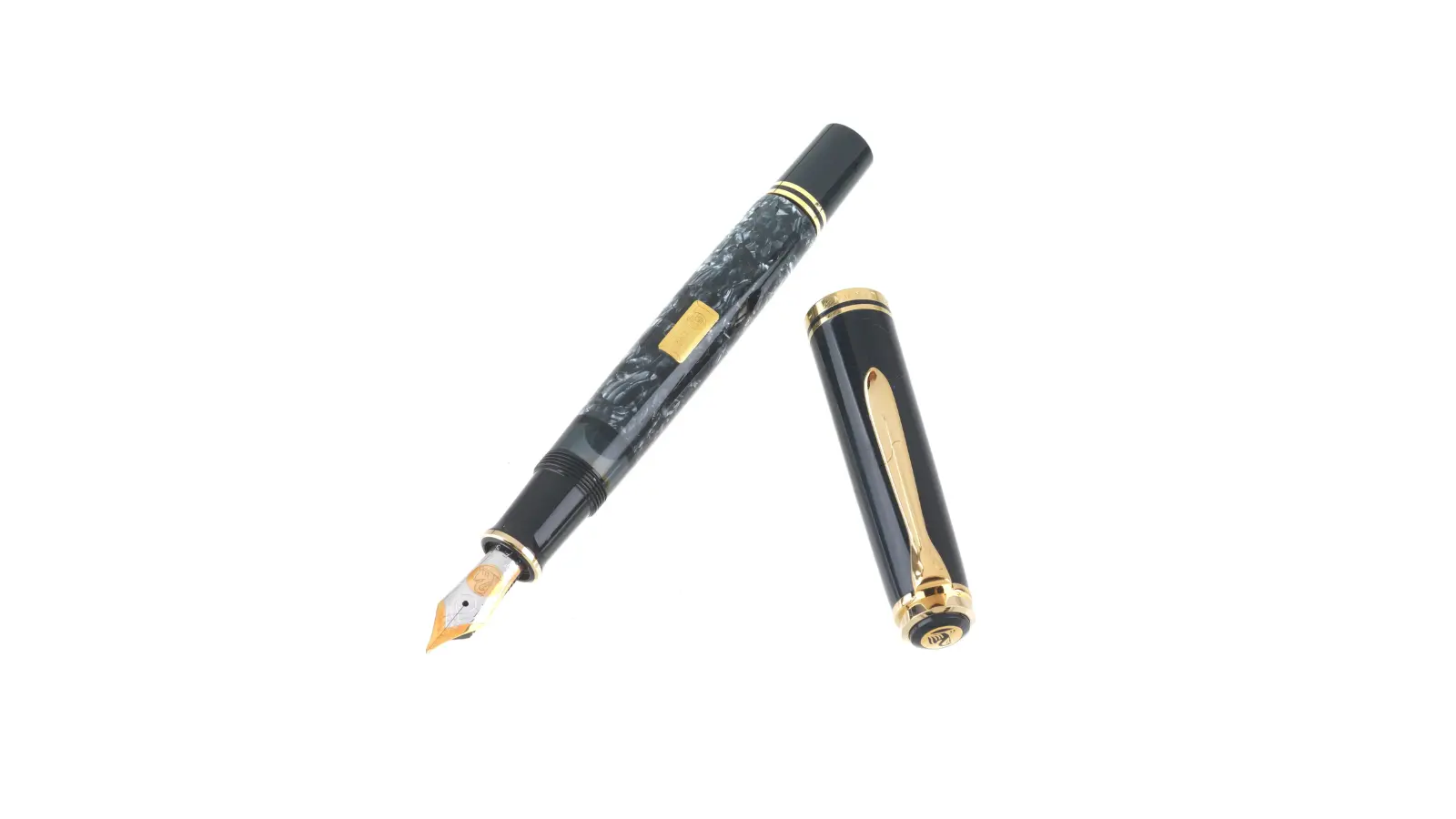 Penna stilografica interamente in resina grigia marmorizzato e antracite. Clip e finiture dorate.