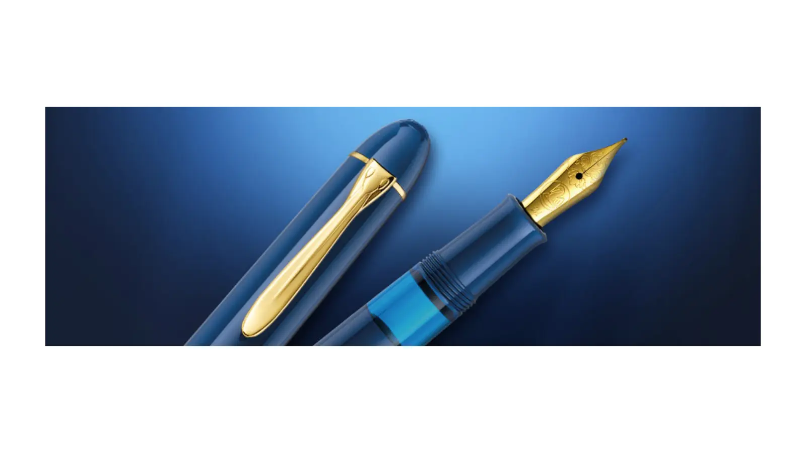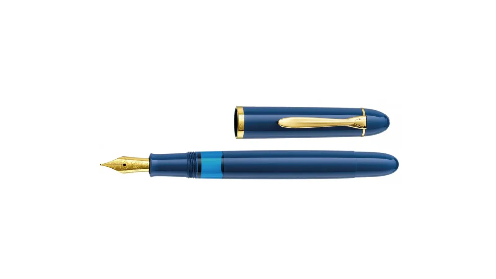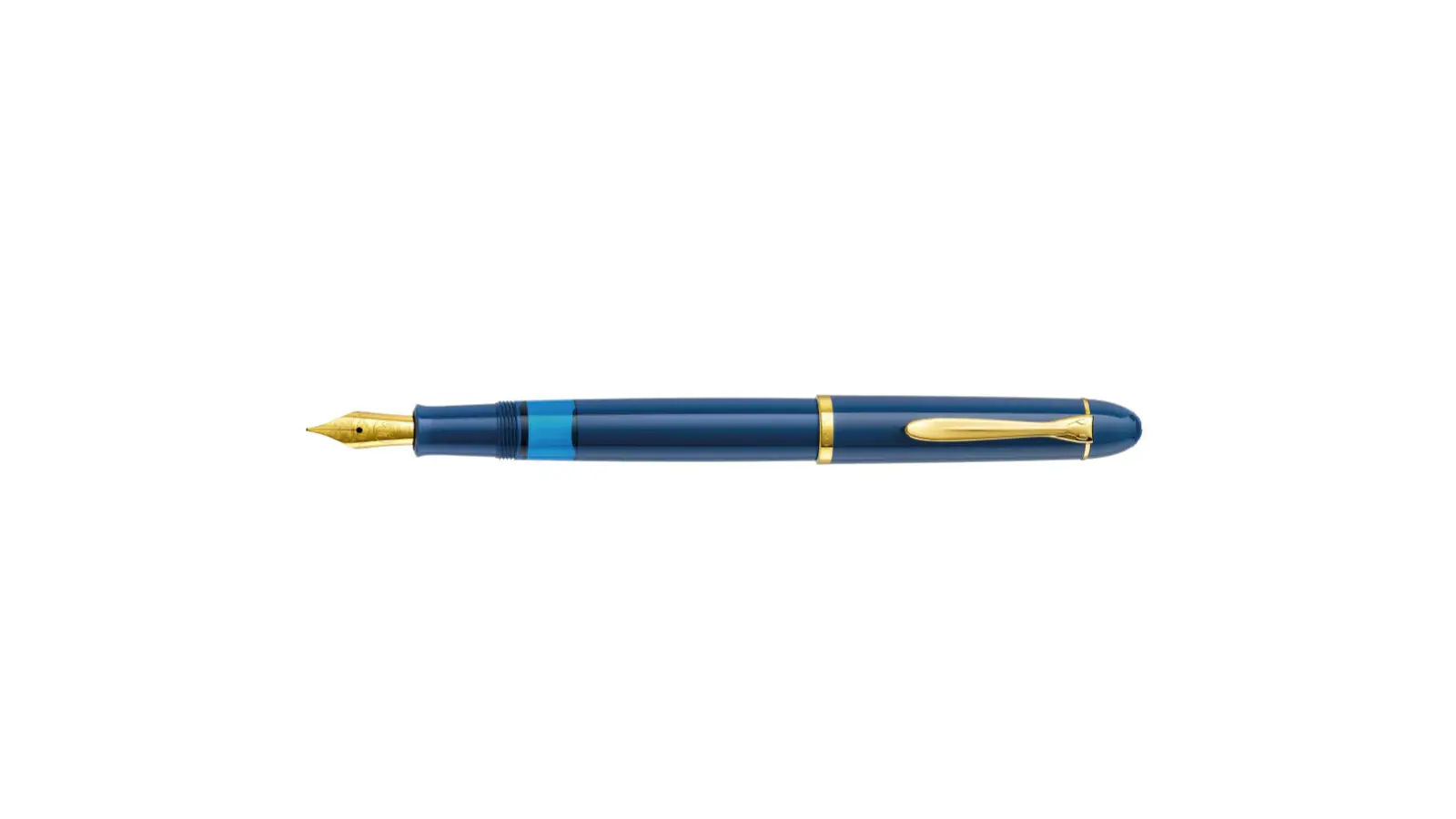 Penna stilografica con fusto di colore blu. Clip a forma di becco di pellicano con finiture placcate in oro. Finestrella dell’inchiostro in azzurro chiaro semitrasparente. Pennino Fine o Medio in acciaio inossidabile dorato. Caricamento a stantuffo.