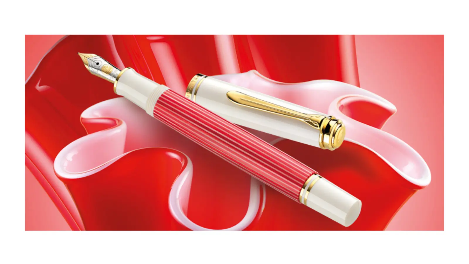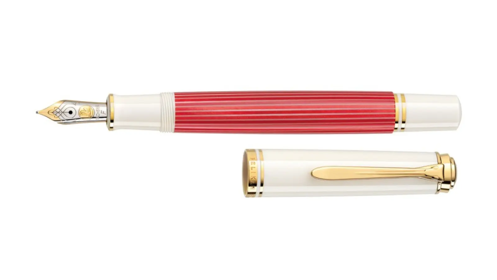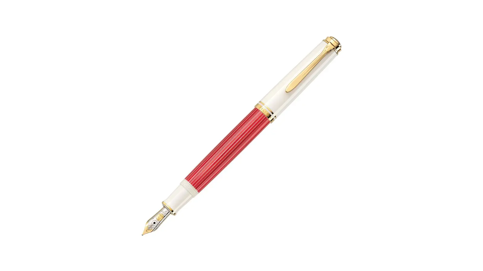 Penna stilografica in edizione limitata; il corpo è in acetato di cellulosa ornato da strisce rosse e bianche alternate rendendo speciale il tradizionale look Pelikan. Per aggiungere un tocco di lusso, tutti gli anellini e l’iconica clip Pelikan sono elegantemente placcati in oro 24 carati. Pennino Fine in oro 14 kt con finiture in rodio. Caricamento a stantuffo.