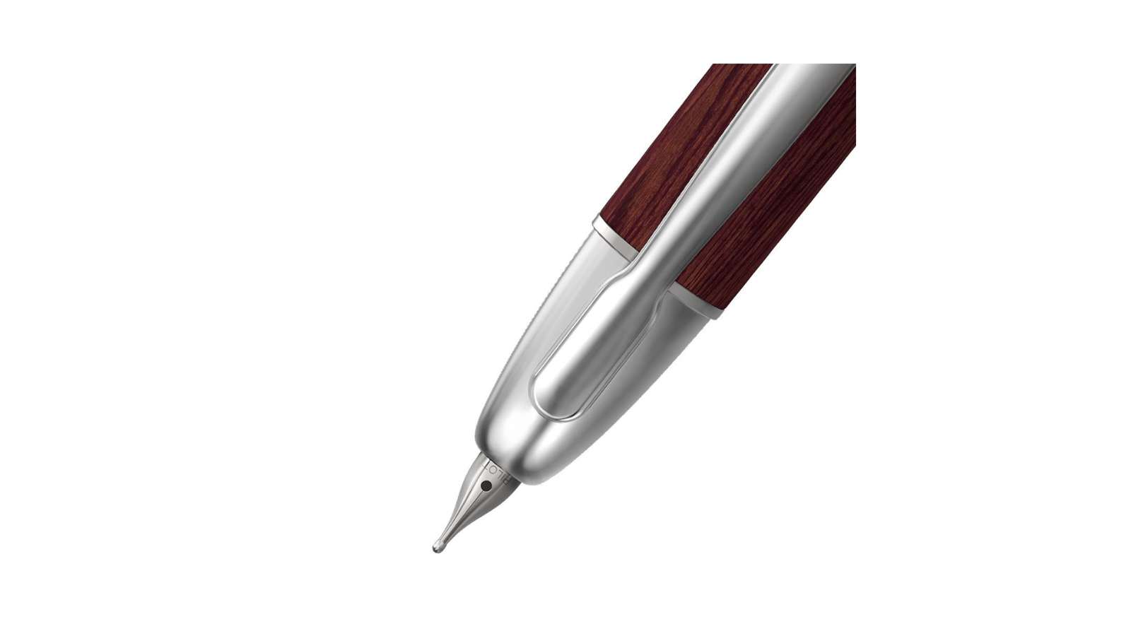 Penna stilografica con fusto in metallo rivestito in legno di betulla rossa. Clip e finiture cromate. Pennino Fine in oro bianco 18kt. Caricamento a cartuccia e/o converter. Meccanismo a scatto.