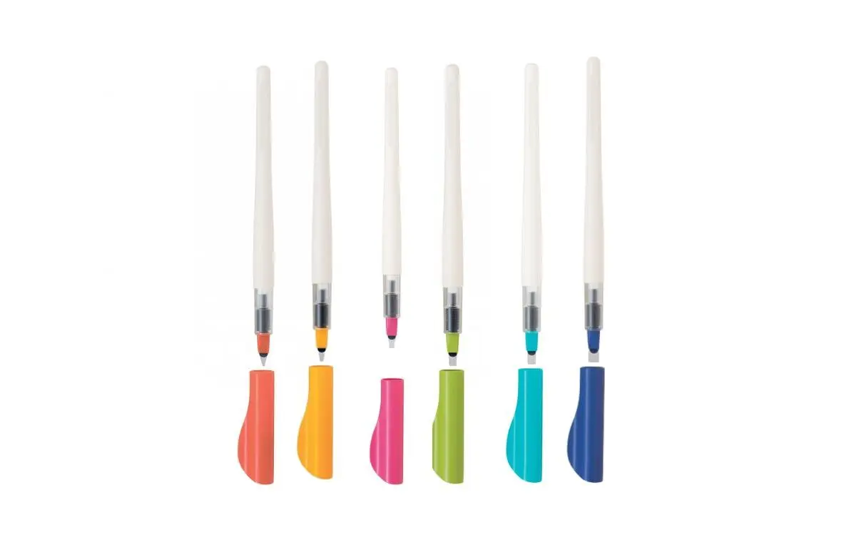 Fusto in plastica di colore bianco e cappuccio colorato in base al pennino di appartenenza. Pennino a lamine piatte parallele.