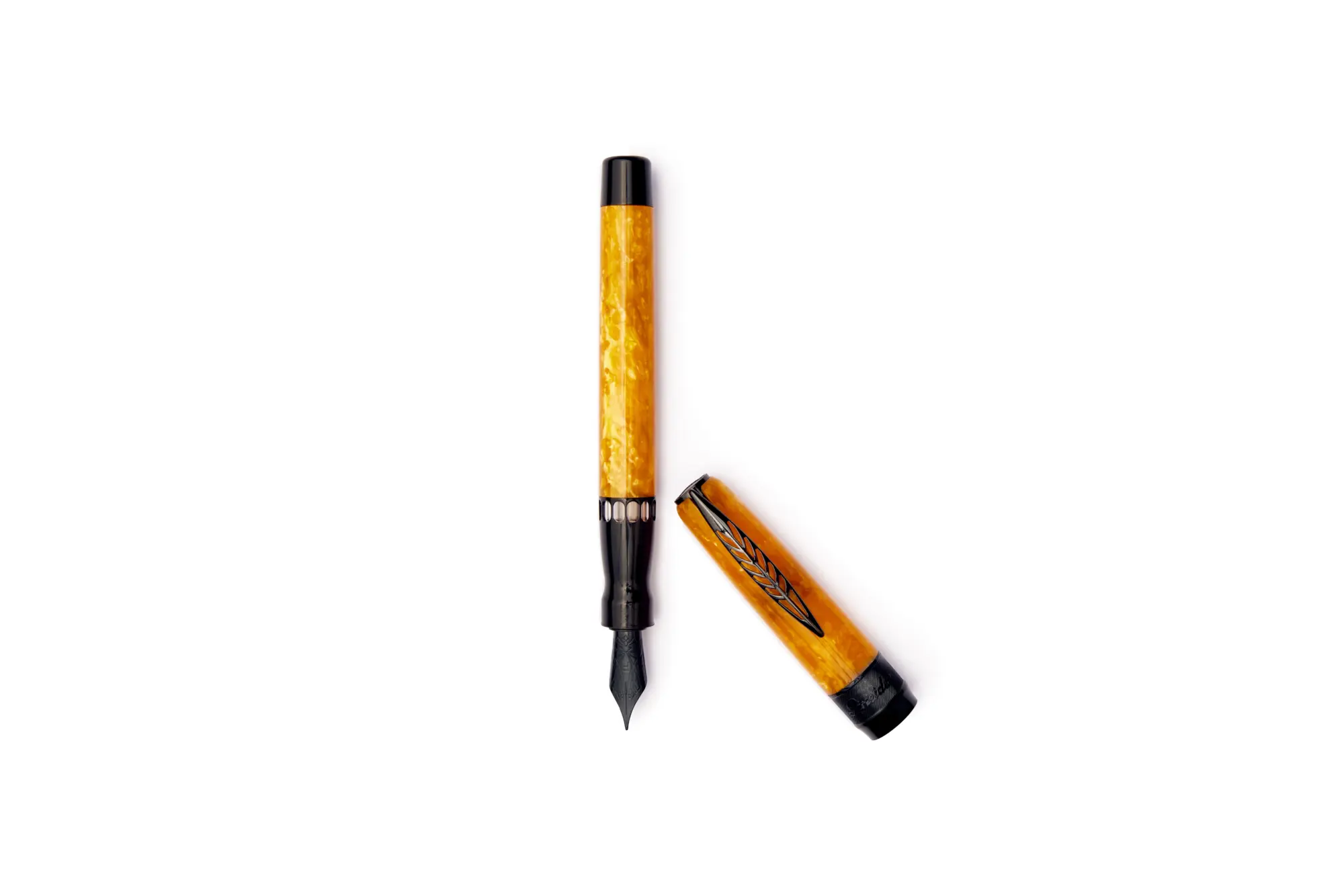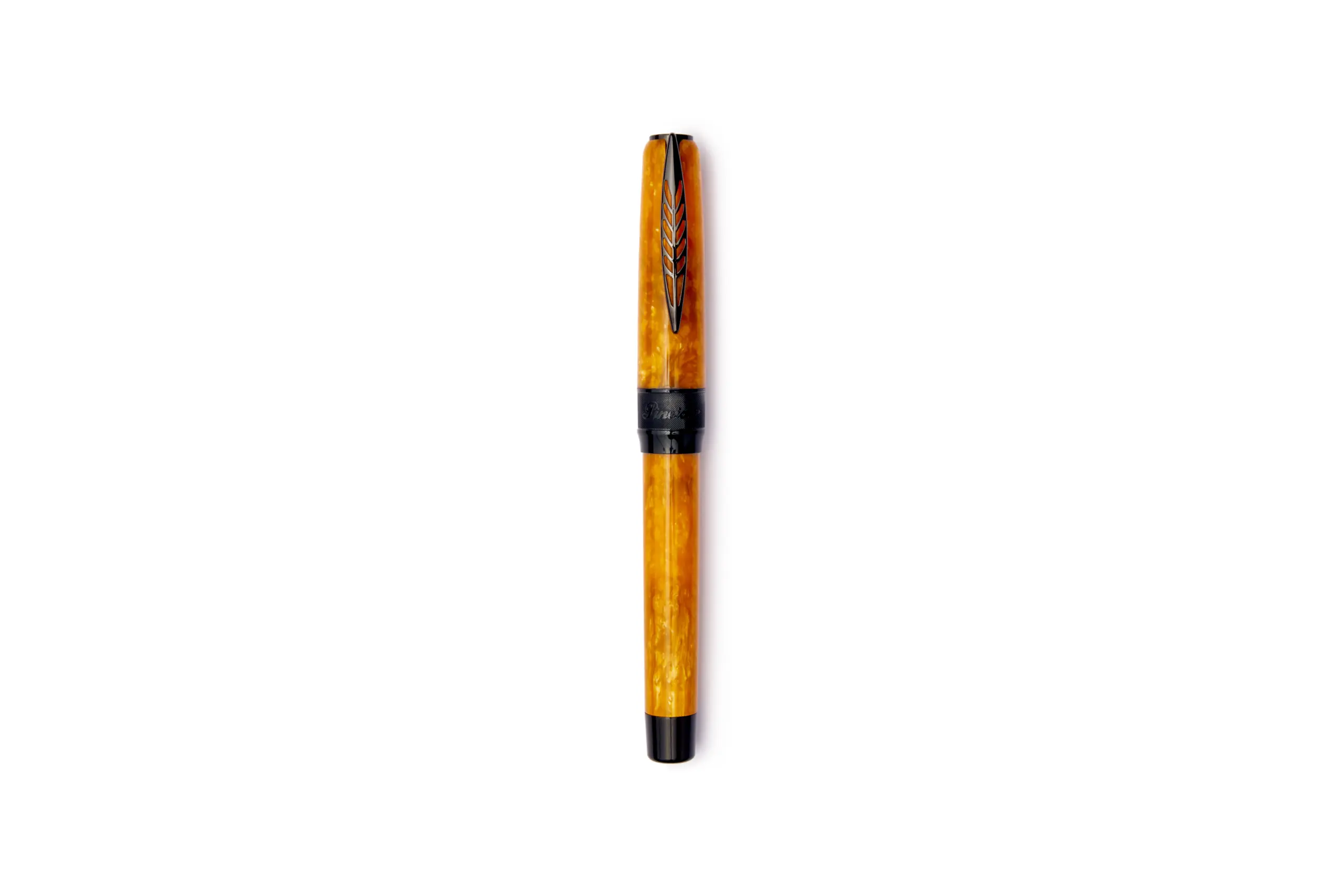 Penna stilografica interamente in materiale acrilico effetto marmorizzato lucido di colore giallo. Clip e finiture nere. Caricamento a cartuccia e/o converter. Pennino Fine in acciaio anodizzato nero.