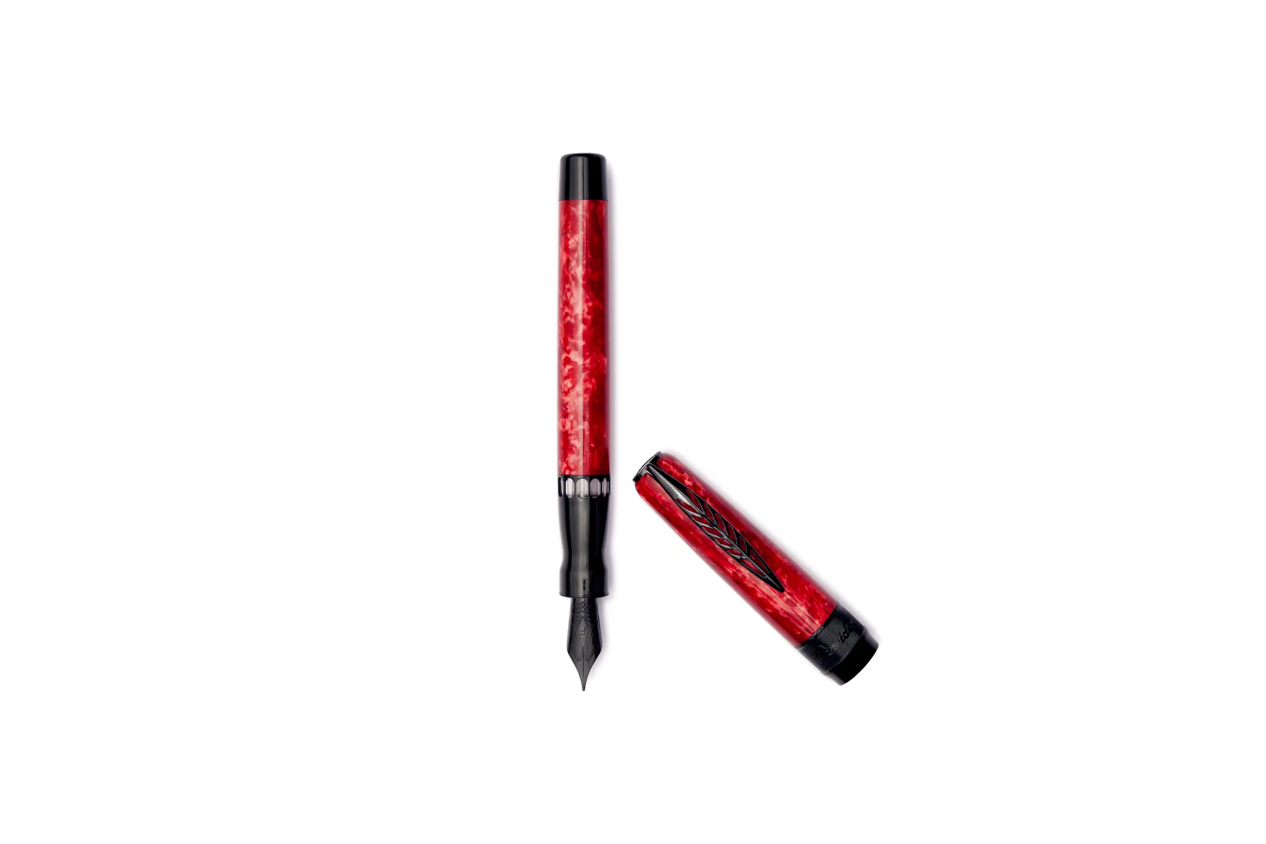 Penna stilografica interamente in materiale acrilico effetto marmorizzato lucido di colore rosso. Clip e finiture nere. Pennino Medio in acciaio anodizzato nero. Caricamento a cartuccia e/o converter.
