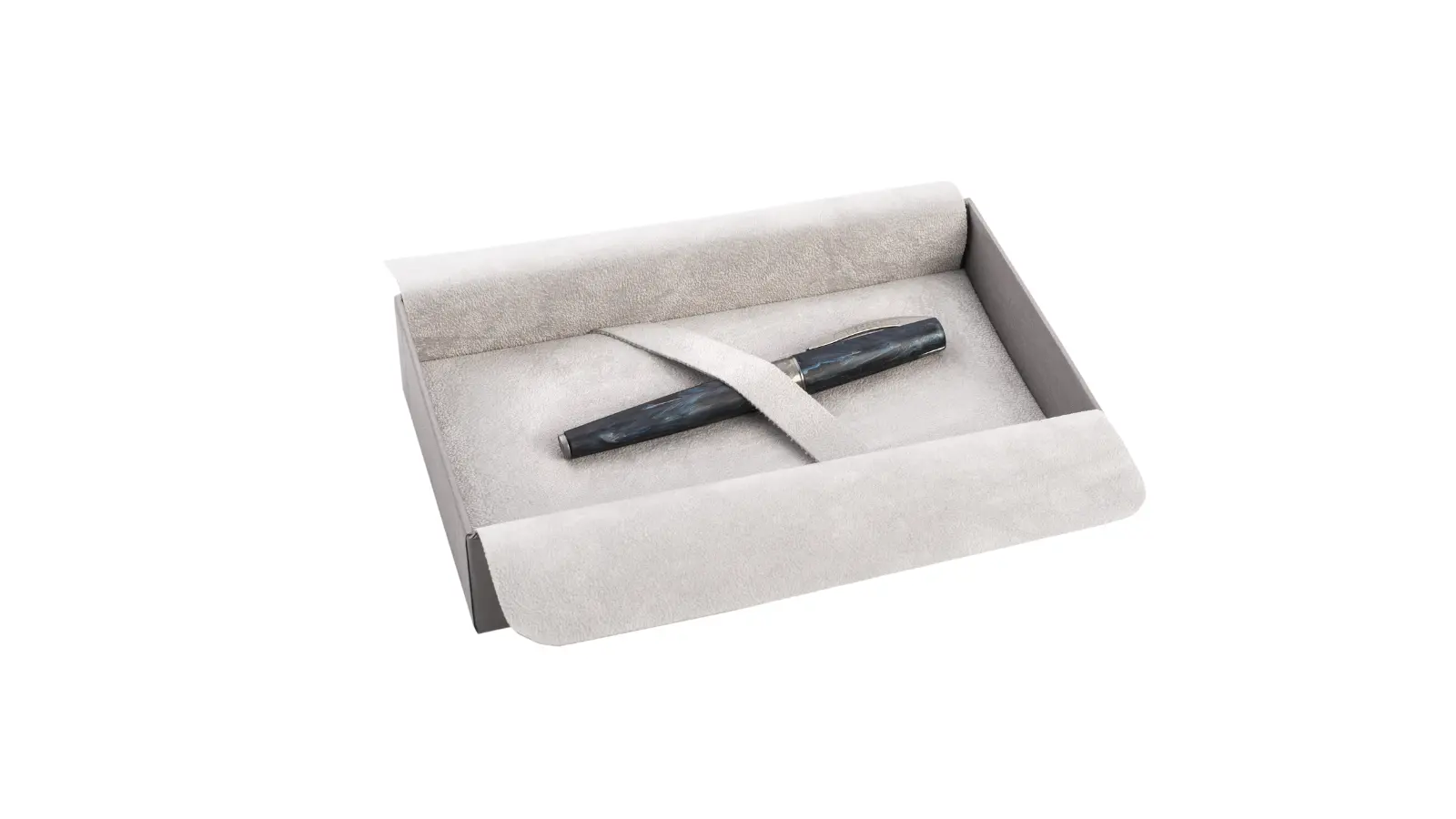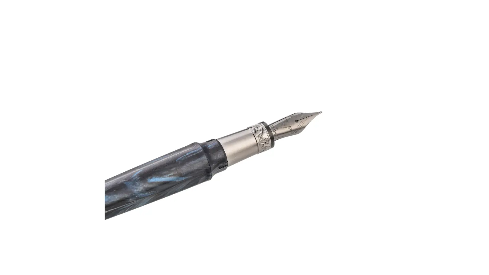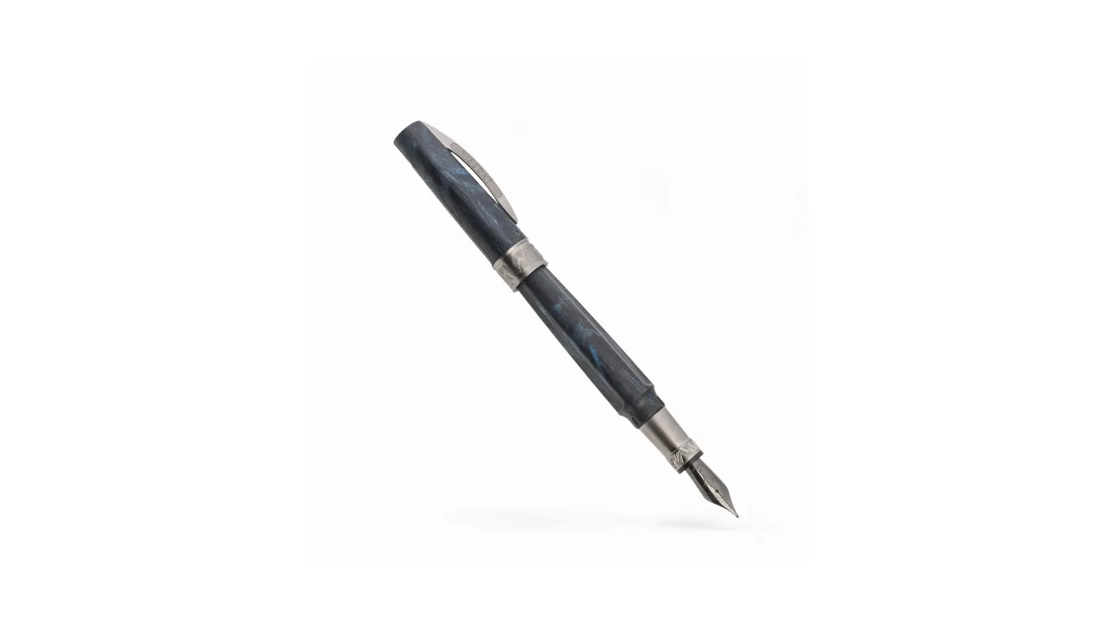 Penna stilografica interamente in resina sabbiata blu scuro. Clip e finiture in rutenio. Pennino Fine o Medio in acciaio inossidabile. Caricamento a cartuccia e/o converter.