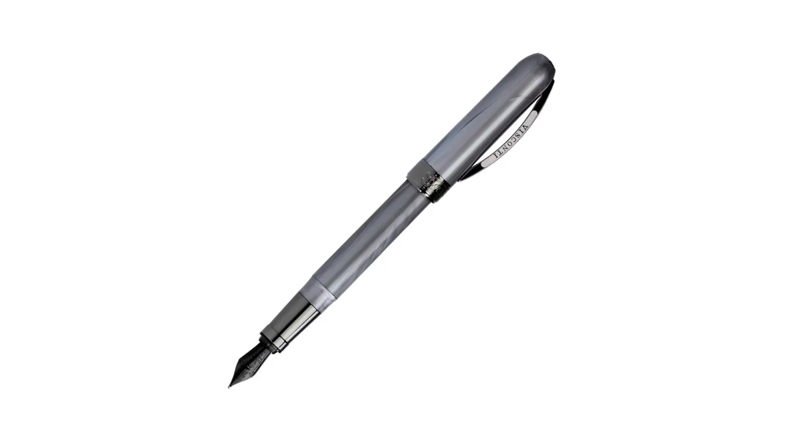 Penna stilografica interamente in pregiata resina variegata con giochi di chiaro scuro di colore grigio. Clip e finiture cromate lucide. Pennino Fine o Medio in acciaio inossidabile di colore nero. Caricamento a cartuccia e/o converter.