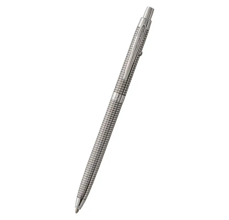 110,00 €Penna a Sfera “Shuttle Space Pen” interamente in metallo cromato con disegno a griglia nera. Meccanismo a clic che estende la punta tramite il pulsante sulla parte superiore ed un pulsante di rilascio sul lato per ritrarla. Refill pressurizzato.